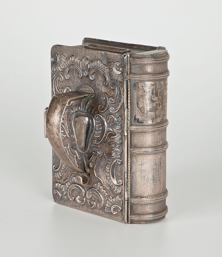 W kształcie księgi; na grzbiecie – napis hebrajski; na okładce frontowej – kartusz pod koroną, w tradycji rokokowej, z motywami muszlowymi; z tyłu podobny kartusz – bez korony oraz wydatny, łamany uchwyt. Księga otwierana, zamykana klamrą ze skobelkiem. U góry otwór do wrzucania datków, opatrzony od wewnątrz parą dzwoneczków.