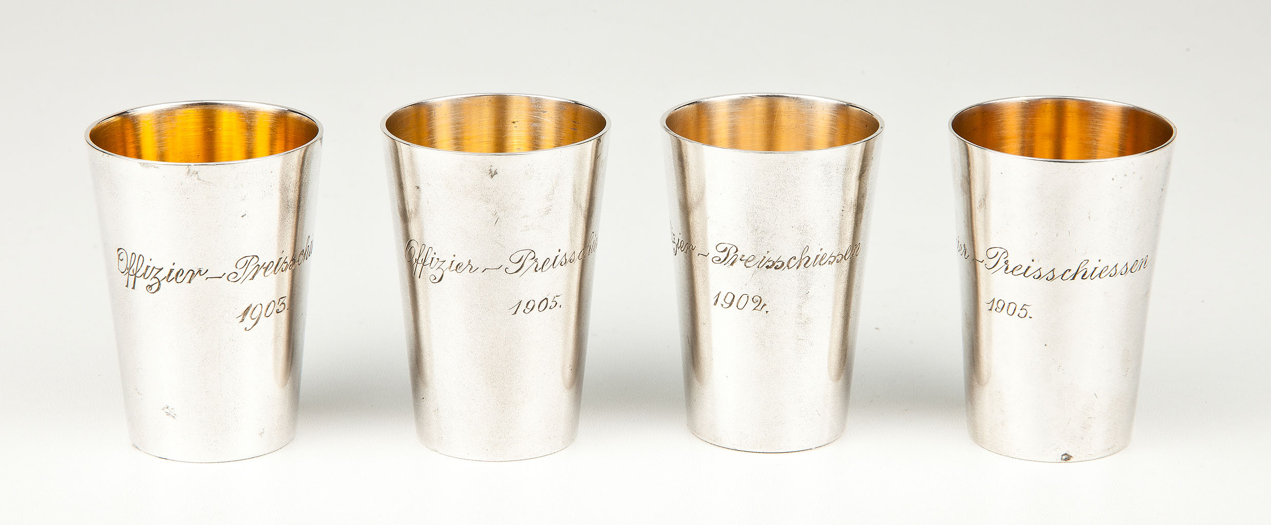 W formie stożkowatych, gładkich kubeczków, z wygrawerowanym na brzuścu napisem: Offizier-Preisschiessen. Poniżej data: na dwóch kubkach: „1905”, na pozostałych: „1902” i „1903”. Wnioskując z napisu – kieliszki stanowiły nagrodę w zawodach strzeleckich. Na spodzie nazwisko kupca: EICHERT i probiercze cechy niemieckie. Niemcy, 1902-1905.