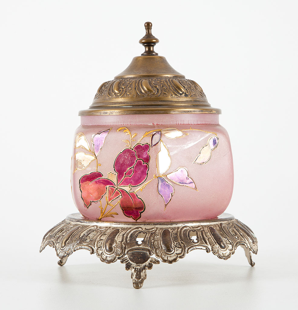 Z dnem kolistym, przeźroczystym; korpus 6-boczny, dekorowany gałązką kwiatową, malowaną iryzującą farbą; całość na podstawce z tłoczonej blachy mosiężnej, na 3 nóżkach, z ozdobnym, małżowinowym kołnierzem; podobnie zdobiona metalowa pokrywka. Niemcy(?), 1 ćw. XX w.