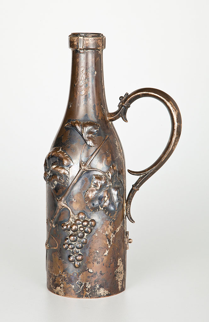 Złożony z dwóch połówek połączonych pionowym zawiasem. Jedna z połówek zdobiona tłoczonymi motywami winnej latorośli, druga gładka. Na szyjce grawerowany monogram wiązany właściciela: „BG”. Na spodzie nazwisko kupca: EUGEN MARCUS oraz niemieckie cechy probiercze i znak firmy.
