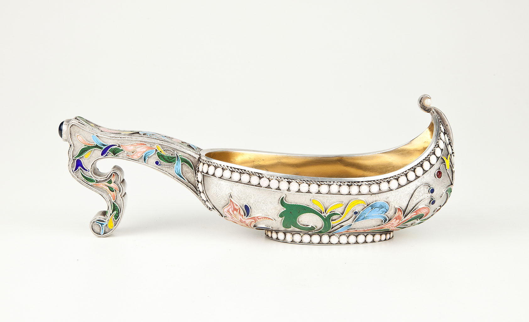 srebro pr. 84, częściowo złocone, emalia komórkowa / wys. 7,5 cm, dł. 21 cm, szer. 7,5 cm; waga 344 g