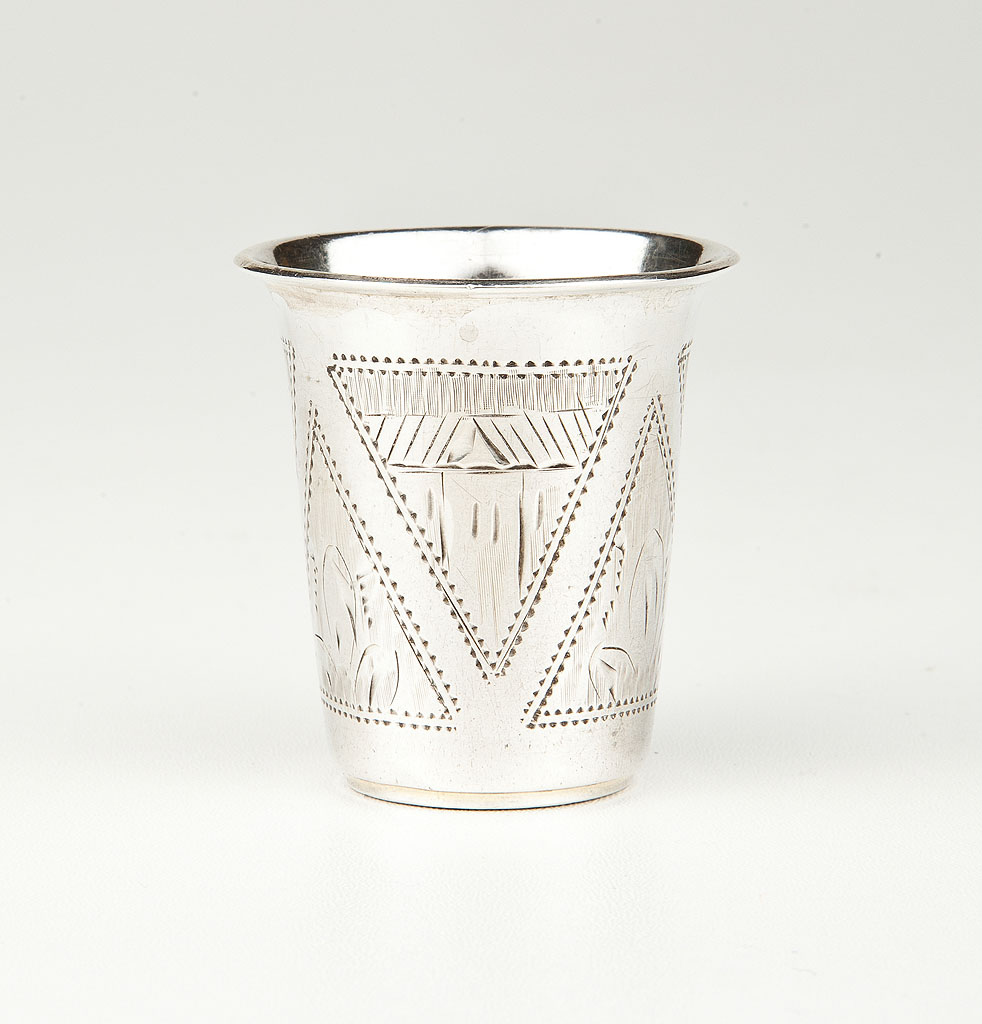 O kształcie konicznym, grawerowany w motywy architektoniczne i floralne, umieszczone naprzemiennie w trójkątnych polach. Kijów, złotnik – monogramista „I.E.Z.”, XIX/XX w.