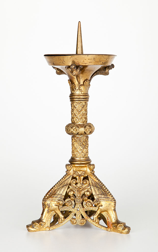 Na trójściennym, ażurowym cokole, z motywem kwiatów na bokach i figurami smoków na spływach. Trzon z nodusem zdobionym rozetkami. W zwieńczeniu talerz z kolcem do osadzania świecy; od spodu talerza – trzy pełnoplastyczne jaszczurki.