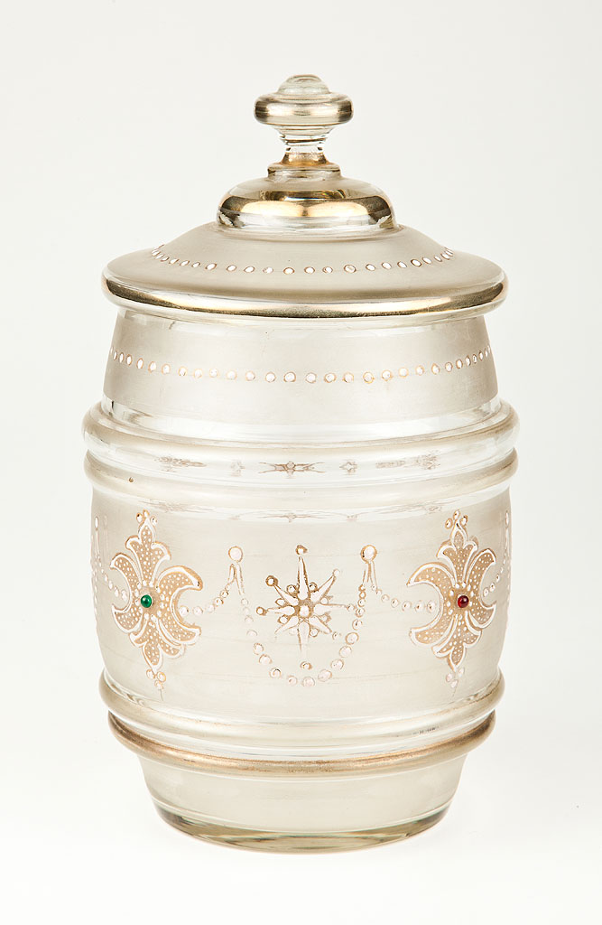 W formie beczułki z zaznaczonymi obręczami; pośrodku brzuśca pas dekoracji reliefowej z motywem stylizowanych rozet i gwiazd, połączonych festonami perełkowymi; pokrywa z guzikowym uchwytem i wyciętym przy krawędzi otworem na chochlę. Niemcy(?), pocz. XX w.