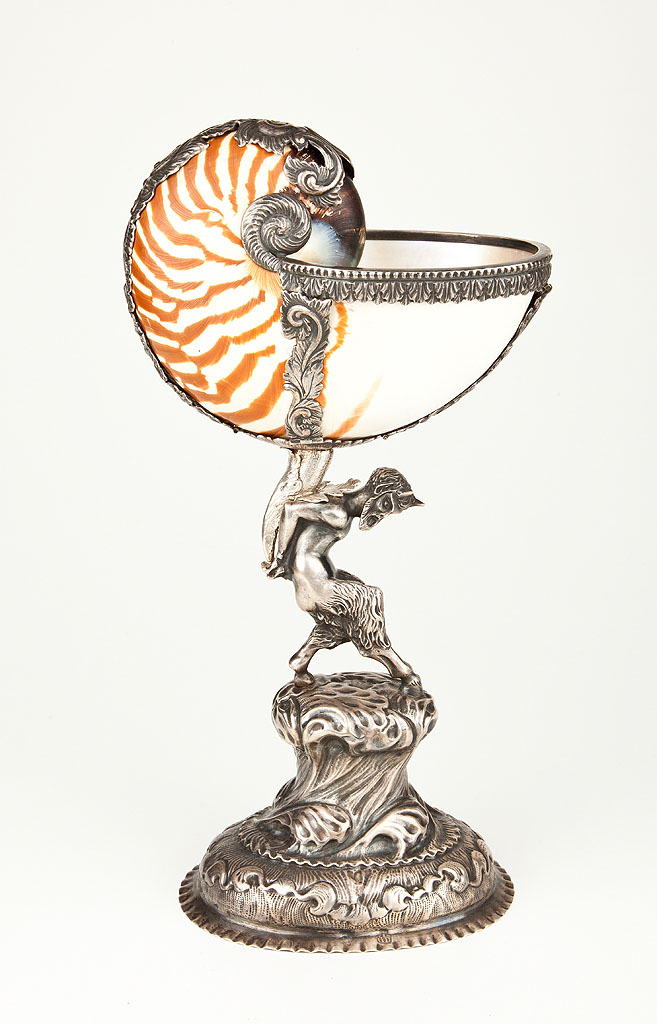 Na owalnej, wysklepionej stopie, zdobionej grzywami fal morskich. Trzon w formie figurki brodatego bożka Pana, z rogami i koźlimi nóżkami, niosącego na grzbiecie czarę z muszli, ujętej listwami srebrnymi, dekorowanymi motywem akantu, palmet, perełek i wolut. Niemcy; złotnik „IGD”- cecha wpisana w treflowy kontur.