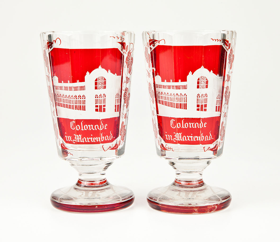 Koliste stopy, z rżniętą na spodzie gwiazdą Dawida i wiązanymi monogramami; „AR” i „JR”. Brzuśce koniczne, lekko rozszerzające się ku górze, fasetowane wielobocznie, z widokiem budynku zdrojowego, podpisanego: „Colonnade / in Marienbad”, w obramieniu z wici kwiatowej. Czechy, 3 ćw. XIX w.