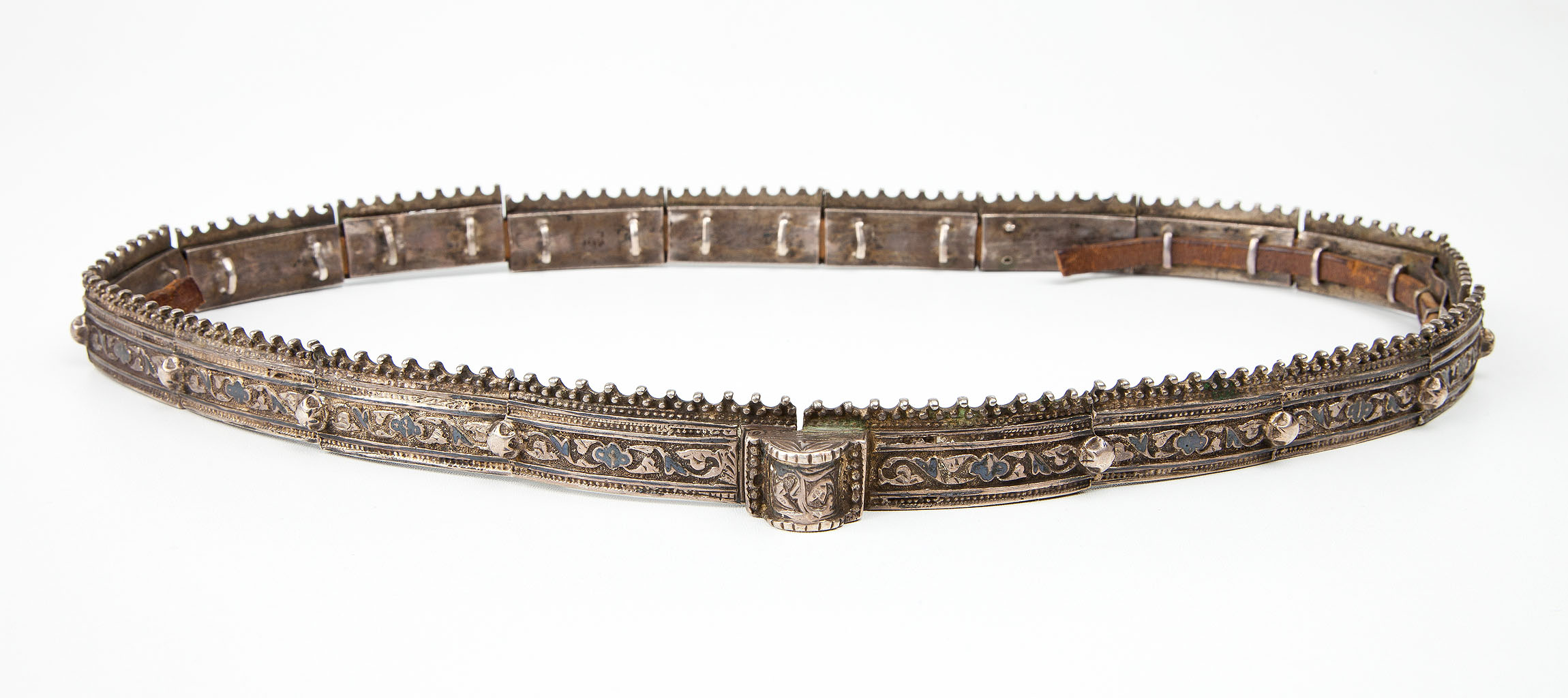 Z ośmiu prostokątnych płytek srebrnych, zdobionych stylizowaną wicią roślinną; wzdłuż dolnej krawędzi pas perełek i drobnych ząbków; na spojeniach płytek – guzy. Niewielka, wypukła klamerka z zapięciem na haczyk i pętelkę. Pod warstwą srebrną – rzemień, zachowany tylko częściowo. Rosja, XIX/XX w.