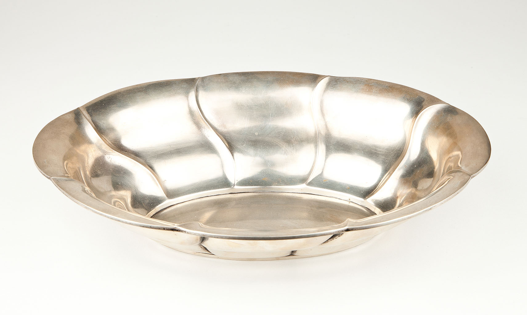 Owalna paterka do chleba, z gładkim lustrem i kołnierzem zdobionym esowatymi żebrami. Niemcy, Schwabisch Gmünd, firma Hugo Bohm; po 1888.