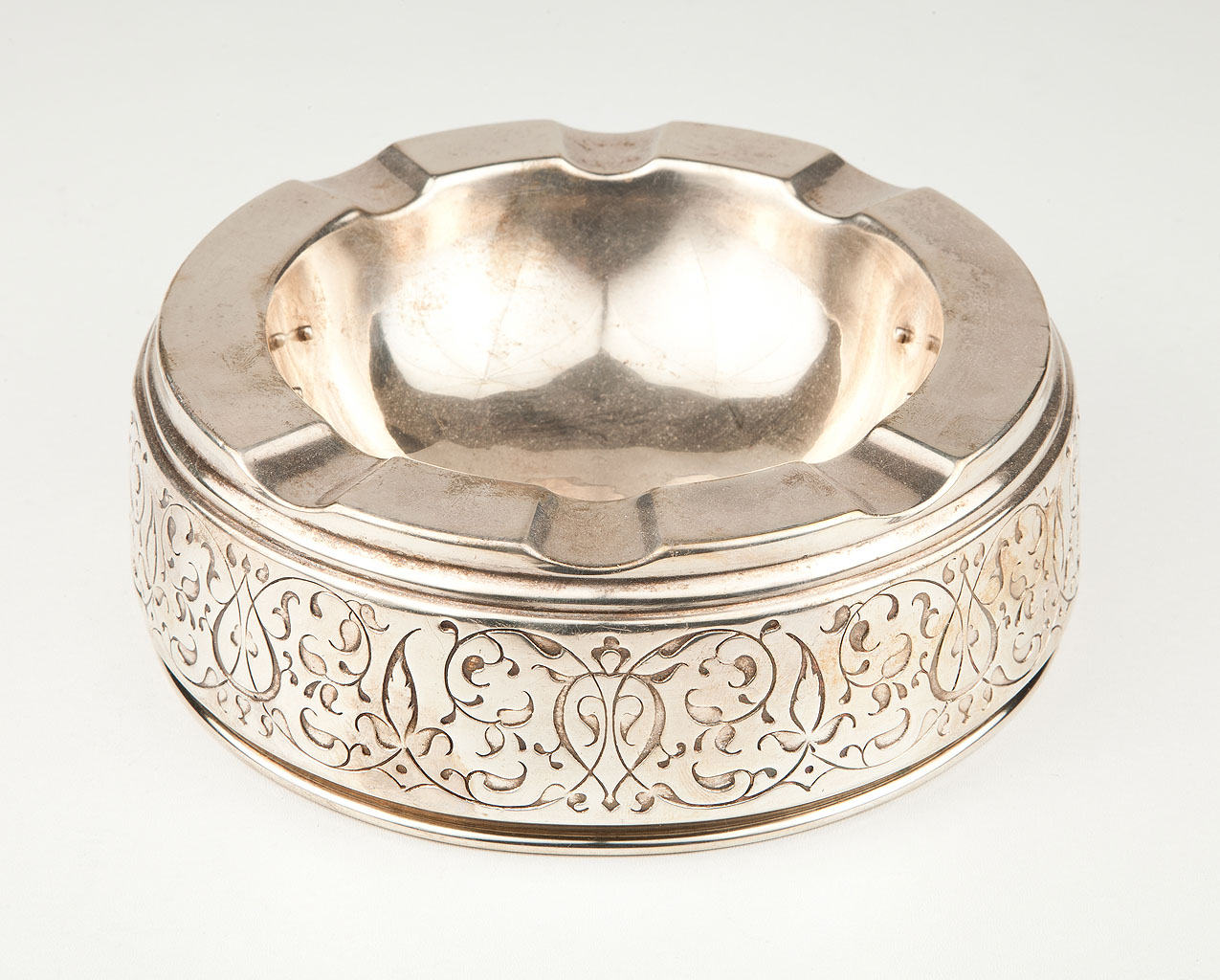Okrągła, z grawerowaną na obrzeżach w ozdobne wici roślinne listwą.