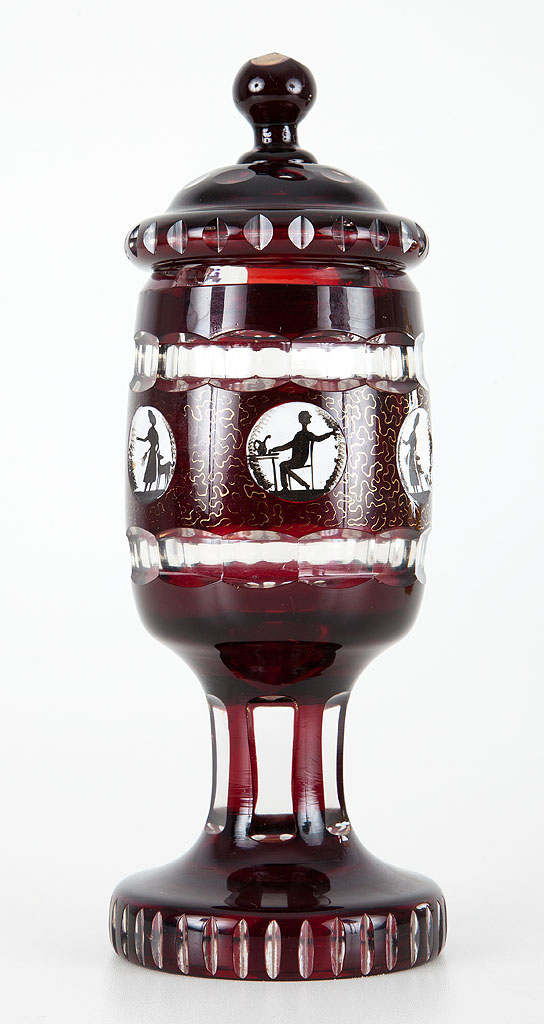 Z kolistą stopką, karbowaną na krawędzi; trzon wielogranny, fasetowany; korpus beczułkowaty, zdobiony sześcioma kolistymi, wklęsłymi rezerwami z czarnymi sylwetkami ludzkimi na białym tle. Ścianki brzuśca lazurowane rubinowo i dekorowane delikatną, złotą wicią. Pokrywa zwieńczona kulistym uchwytem.Czechy(?), Śląsk(?), 1 tercja XX w.