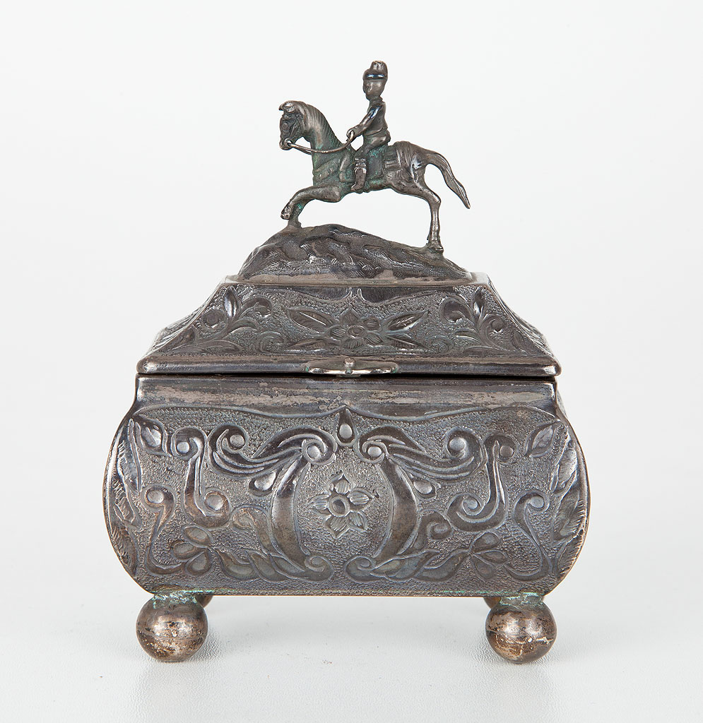 W formie skrzyneczki wspartej na 4 kulkach. Ścianki wybrzuszone, dekorowane motywem kwiatów, liści akantu, rozetek; wieczko wysklepione, z figurką jeźdźca. Rosja, k. XIX w.