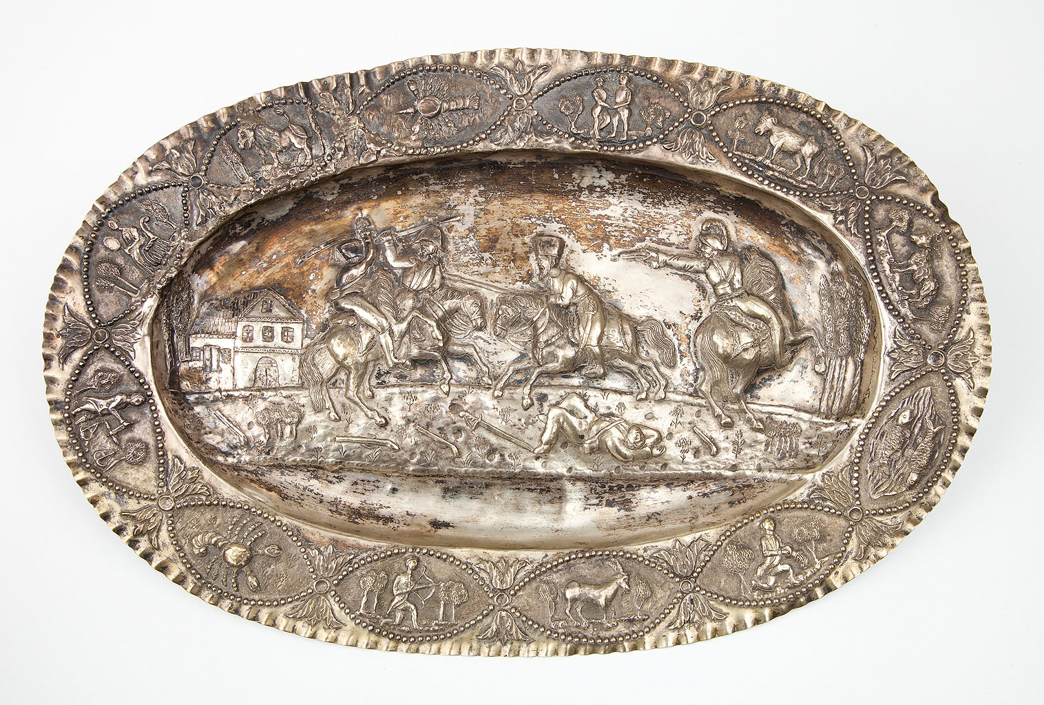Owalna, z repusowaną w lustrze sceną bitewną z postaciami konnymi. Na kołnierzu w perełkowych owalach – wyobrażenie znaków Zodiaku. Brak sygnatur. (Taca o podobnym zdobieniu kołnierza, ale z inną – rytualną sceną żydowską w lustrze – znajduje się w zbiorach Muzeum Narodowego w Warszawie; ocechowana jest lwowskimi znakami probierczymi).