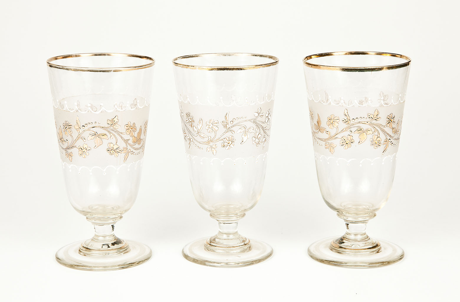Na kolistych, płaskich stopach i krótkich, szpulowych trzonach. Czasze smukłe, stożkowe, ozdobione szerokim, matowionym pasem dekoracji z malowaną wicią kwiatową – złotą, srebrną i białą.