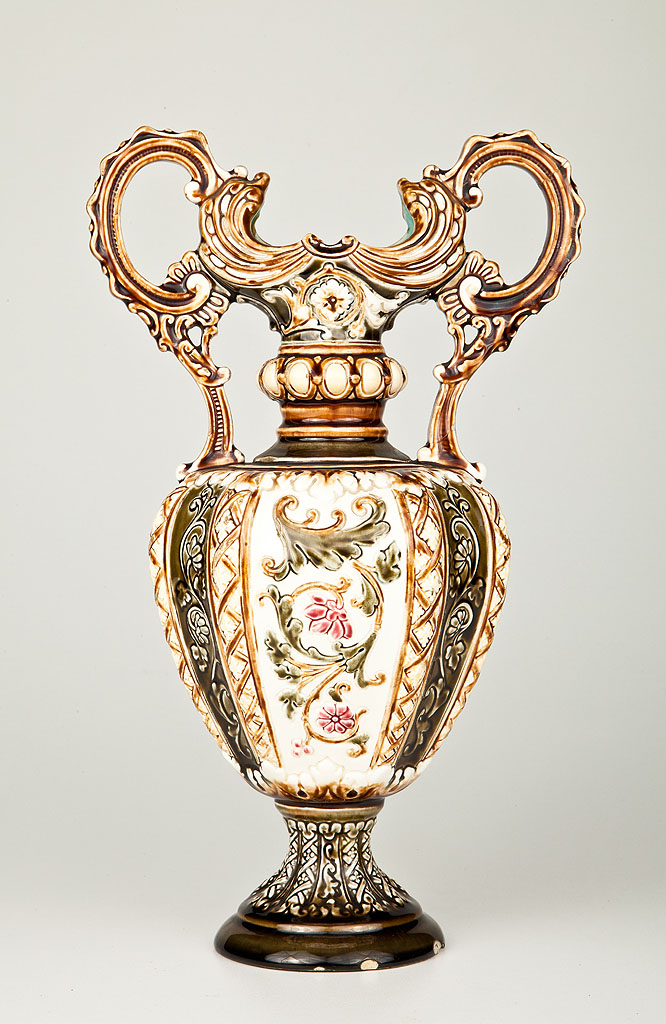 Na kolistej stopie. Korpus jajowaty, podzielony pionowymi żebrami z plecionką na pola zdobione motywami kwiatowymi. Szyja krótka opasana pierścieniem z kaboszonami. Wylew łódkowaty; po jego obu stronach ucha zdobione motywami muszlowymi, wolutami i palmetami. Europa Zachodnia, 1 poł. XX w.