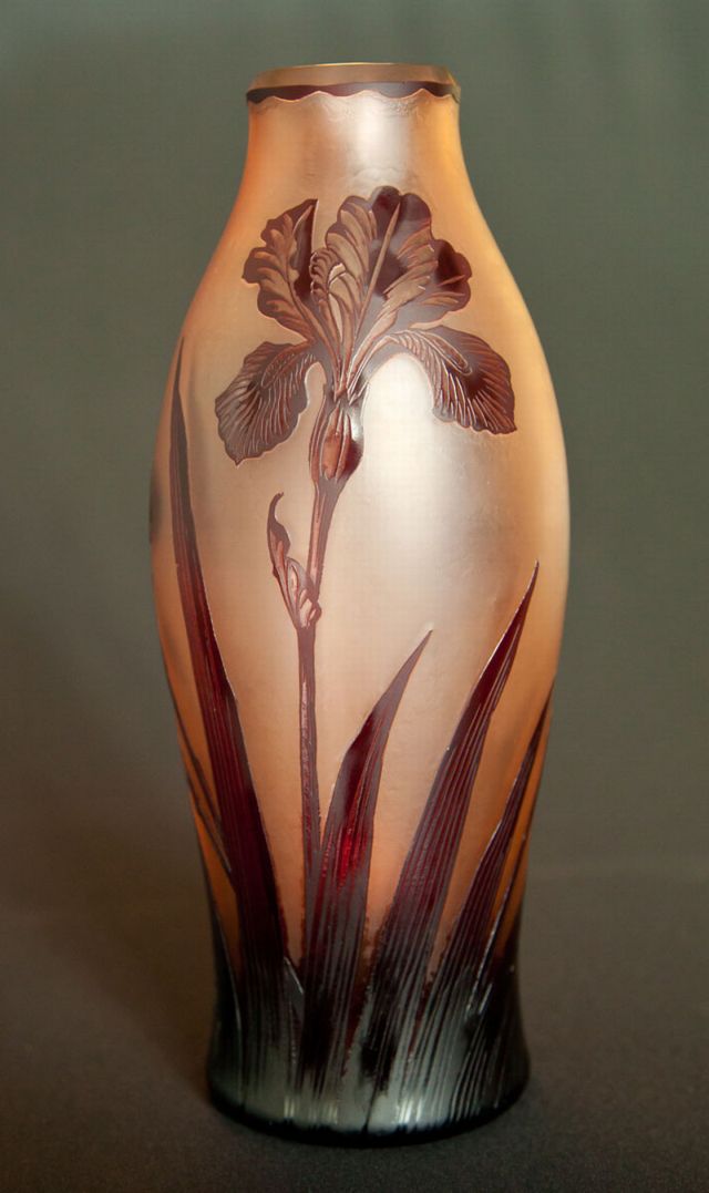 Na kolistej podstawie, z owoidalnym brzuścem, zdobionym gałązkami purpurowych irysów na różowym tle.Czechy, Novy Svet, huta Harrach; pocz. XX w.
