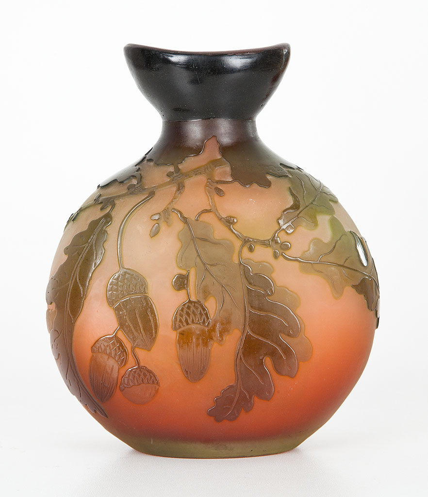 Z kolistym, spłaszczonym brzuścem; podstawa i wylew – owalne; zdobienie z motywem ciemnozielonych gałązek dębowych, na tle różowo-seledynowym. Francja, Nancy, pocz. XX w.