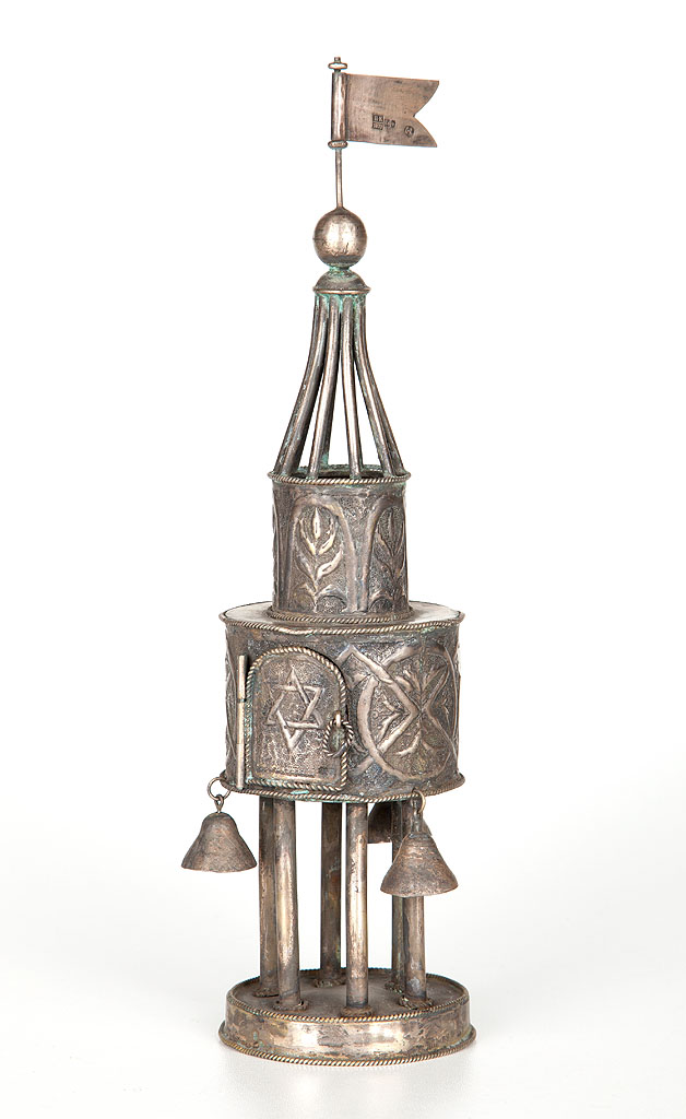 Na kolistej stopie; trzon utworzony z sześciu słupków, podtrzymujących cylindryczny pojemnik zdobiony tłoczonymi wzorami kół i rombów; na drzwiczkach – gwiazda Dawida; pod pojemnikiem podwieszone 3 dzwoneczki. Wyżej walcowata wieżyczka ze spiczastym daszkiem z prętów, zwieńczonym kulą i chorągiewką, z zatartym napisem hebrajskim. Znaki probiercze na korpusie i chorągiewce, różniące się inicjałami probierzy i złotników (!).