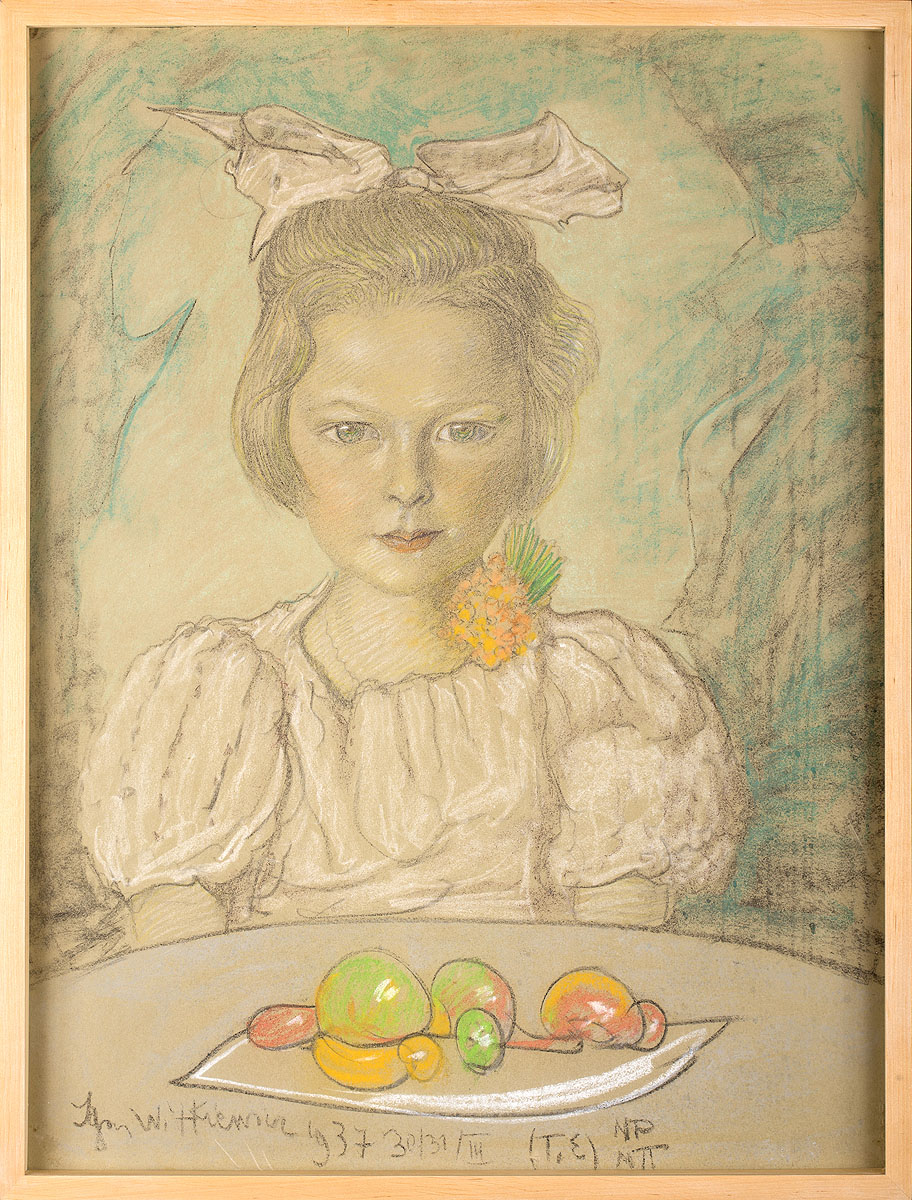 Portret dziewczynki Witkacy wykonał w ramach stworzonej przez siebie w 1925 r. jednoosobowej Firmy Portretowej „S.I. Witkiewicz”. Modelka została przedstawiona w sposób typowy dla portretu dziecięcego – frontalnie, w popiersiu, za stołem, na którym ustawiono syntetycznie ujęty półmisek z owocami. Jednak zamiast określonego w 7. punkcie Regulaminu Firmy „typu dziecinnego” oznaczonego literami B+E, artysta zastosował „czysty” typ E, który opisał jako „dowolną interpretację psychologiczną, według intuicji Firmy […] nie zawsze możliwy do wykonania”. W praktyce Witkacy stosował typ E portretując piękne kobiety – takie, które mu się podobały, najczęściej blondynki o niebieskich oczach. Modelka na omawianym portrecie ma wprawdzie typową dla kilkuletnich dziewczynek dużą kokardę na czubku głowy, jednak jej twarzyczka z oczami o opadających powiekach i ściągniętych ustach, intensywnie, z napięciem wpatrzona w widza jest de facto twarzą dorosłej kobiety. Artysta najwyraźniej zobaczył w dziecku jego przyszłość i mimo szafażu charakterystycznej dla portretów dziecięcych, potraktował portret jak wizerunek dorosłej osoby, co zaznacza też kwiat na lewym ramieniu małej kokietki. Wykonanie portretu Witkacy odnotował w liście do żon pisanym w Zakopanem w dniu 30 marca 1937 roku: