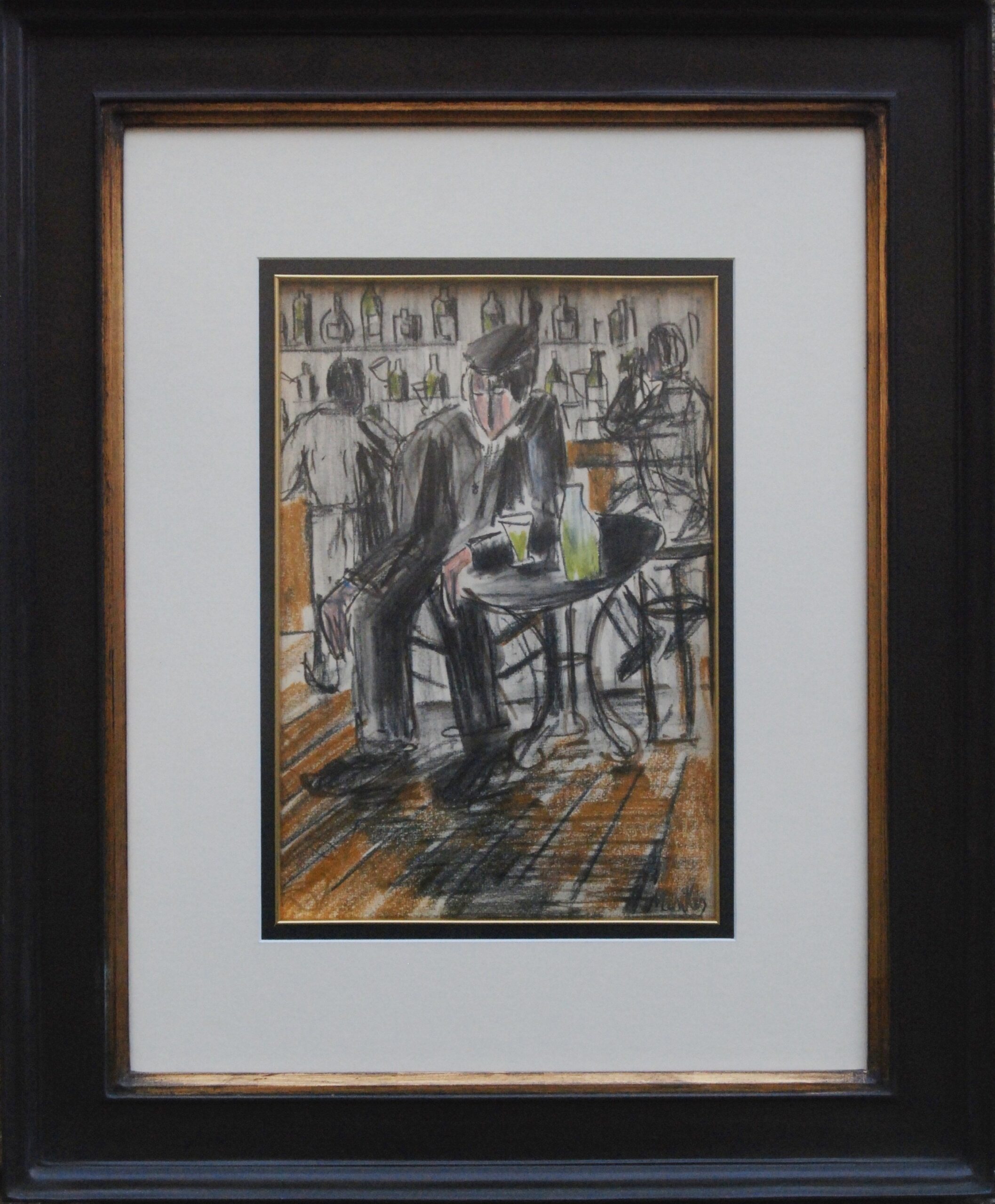 W rysunkach Menkesa, zwłaszcza tych należących do kresu amerykańskiego, dominuje dynamicznie prowadzona kreska. Sceny we wnętrzach, jak ta w oferowanej pracy, oparte są na zrównoważonych, wielokierunkowych układach linii. Całość posiada głębię przestrzenną a postać mężczyzny siedzącego przy stoliku potraktowana jest z tą samą schematycznością co przedmioty go otaczające. Układ kresek przywołuje na myśl gęstą sieć i powoduje, że postać zlewa się niemalże z tłem. Całość utrzymana jest w kolorystyce bieli i czerni tylko gdzieniegdzie przełamanej kolorowym akcentem żółcieni i pomarańczy.