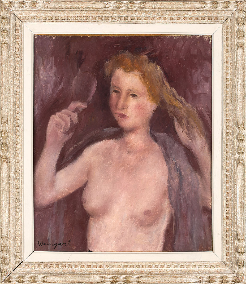 Joachim Weingart urodził się w Galicji w 1875 roku, zginął w Auschwitz w 1942. Był polskim artystą malarzem pochodzenia żydowskiego, członkiem z tzw. Szkoły Paryskiej. Po ukończeniu gimnazjum we Lwowie rozpoczął 1912 roku naukę rysunku w Szkole Przemysłu Artystycznego w Weimarze. Po raz pierwszy wystawił swoje prace w tym samym roku w lwowskiej Szkole Rzemiosła Artystycznego. Dwa lata później wyjechał do Wiednia, gdzie uczęszczał do Akademii Sztuk Pięknych. Wsparcia materialnego udzielał wówczas młodemu artyście przemysłowiec i mecenas Carol Kratz, dzięki któremu w 1916 roku Weingart udał się do Berlina. W 1922 roku artysta poznał Zygmunta Menkesa i Alfreda Aberdama w pracowni rzeźbiarza Aleksandra Archipenki. We wrześniu 1923 roku odbyła się wystawa indywidualna prac Weingarta w siedzibie Towarzystwa Przyjaciół Sztuk Pięknych we Lwowie. Z listów Zygmunta Menkesa dowiadujemy się, że w tym samym roku Weingart dołączył do niego w Paryżu. W stolicy Francji artysta odniósł sukces dzięki kupcowi René Gimpelowi. Wystawiał m.in. w La Rotonde razem z Aberdamem, Menkesem i Leonem Weissbergiem. Malarzy tych określa się mianem „Grupy Czterech”. Ich wspólna wystawa odbyła się w roku 1925 w galerii „Au Sacre du Printemps”, prowadzonej przez Jana Śliwińskiego. Po rozwodzie z żoną, córką francuskiego lekarza, Joachim Weingart popadł w depresję. Po wybuchu II wojny światowej, w przeciwieństwie do wielu artystów żydowskiego pochodzenia, nie opuścił Paryża. W 1942 roku został zatrzymany i internowany, a następnie wywieziony do obozu w Auschwitz. Joachim Weingart należał do młodszego pokolenia polskich twórców z kręgu École de Paris, reprezentującego nurt ekspresjonistyczny. Uczestniczył wielokrotnie w Paryskich Salonach Niezależnych. Pozostawił po sobie bogatą spuściznę – ekspresyjne martwe natury, pejzaże, akty i sceny we wnętrzach, często z postaciami kobiet. Rzadko podejmował tematykę żydowską. Jego obrazy są wąsko kadrowane, bogate kolorystycznie i o różnorodnej fakturze.