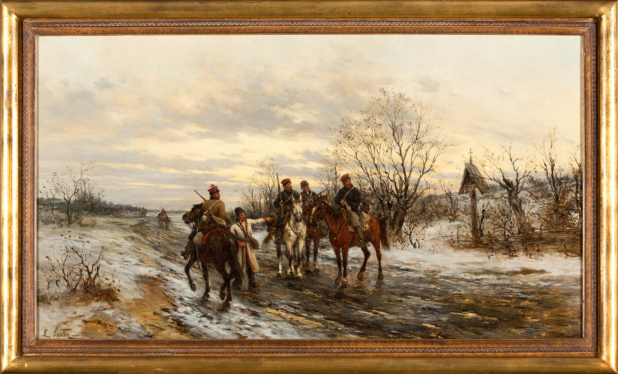 Prezentowany obraz należy do grona rzadkich kompozycji artysty o wyjątkowo dużych rozmiarach. Jest też dowodem na bliskie pokrewieństwo szkoły wiedeńskiej i monachijskiej – największych szkół końca XIX wieku, wyznaczających nie tylko trendy stylowe ale również warsztatowe. Ludwik Gędłek obrazem „Patrol powstańczy” pokazuje absolutną swobodę poruszania się zarówno w stylistyce wiedeńskiej jak i monachijskiej. W tym, niezwykle kunsztownym warsztatowo dziele, Gędłek odchodzi od swoich charakterystycznych tematów i sięga po dużo chłodniejszą paletę barw. Podejmuje temat bliższy Monachium, nie sposób nie odnieść go w temacie również do malarstwa Gierymskich czy Wierusza-Kowalskiego. Przejeżdżający patrol zatrzymuje się obok przydrożnej kapliczki aby „zasięgnąć języka”. Chłód powietrza podkreśla, mistrzowsko ukazany, zalegający stary śnieg. Przepiękne, miękkie światło sączy się na tę scenę zza zimowych obłoków rozciągniętych ponad dalekim horyzontem rozpuszczając lód w kałuże, które niebawem zetnie znów wieczorny mróz. Tę scenę Gędłek wpisuje typowy dla siebie pociągły, horyzontalny format płótna, znamienny zarówno dla manierymonachijskiej jak i wiedeńskiej. Wszystkie te zabiegi, plasują to dzieło wśród najwyższej klasy malarstwa końca XIX wieku, i najlepszych dziełartysty.