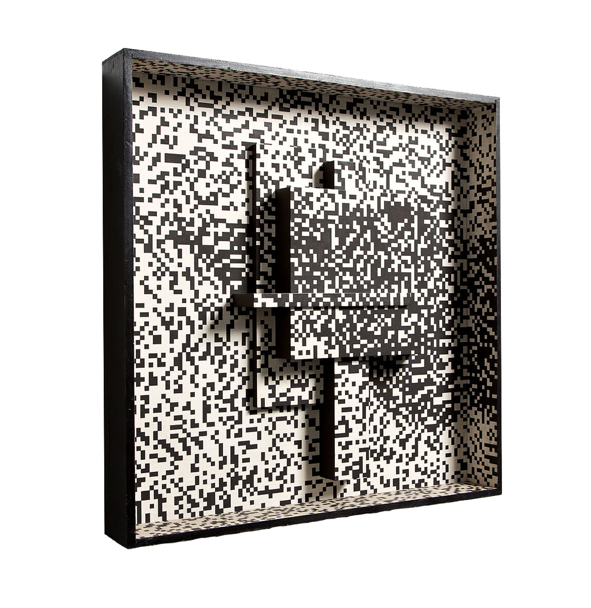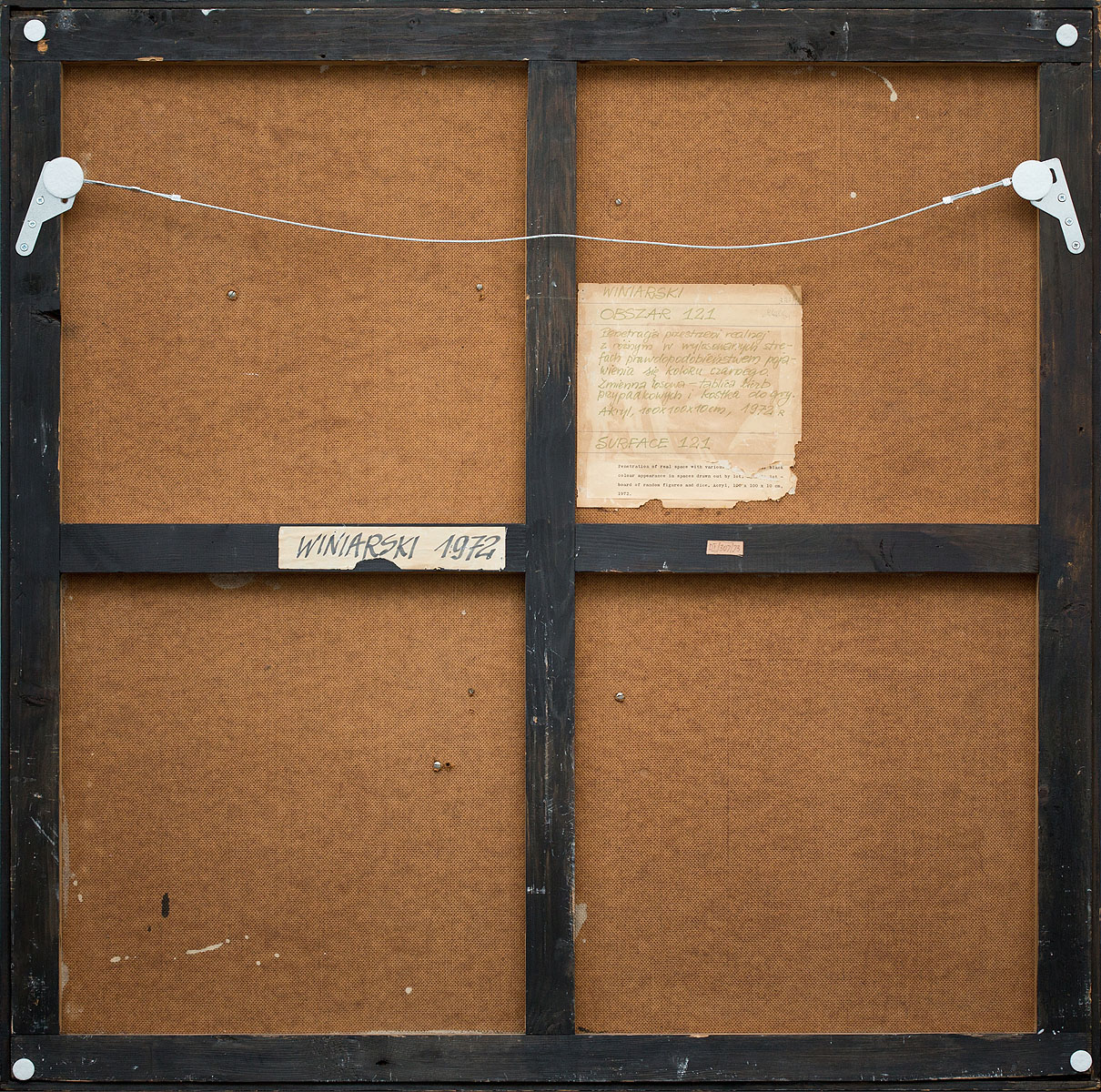 opisany na odwrocie: WINIARSKI 1972 na odwrocie autorska naklejka z odręcznym opisem: WINIARSKI/ OBSZAR 121/ penetracja przestrzeni realnej z różnym w wylosowanych strefach prawdopodobieństwem pojawienia się koloru czarnego. Zmienna losowa – tablica liczb przypadkowych i kostka do gry. Akryl, 100x100x10cm, 1972 R/ SURFACE 121 oraz częściowo uszkodzona naklejka z tym samym opisem w jęz. angielskim