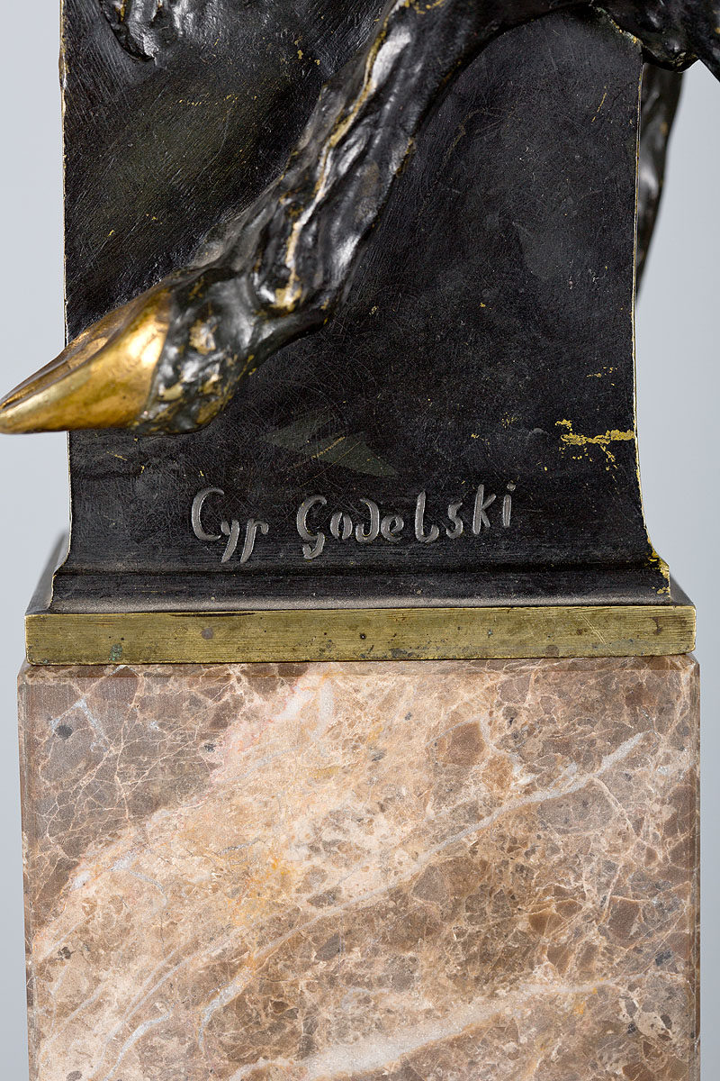 Cyprian Godebski był polskim rzeźbiarzem, który większość swojego życia spędził poza granicami kraju. Był wnukiem Cypriana (Kamila) Godebskiego, który był poetą, pisarzem oraz synem Franciszka Ksawerego, powstańca i działacza emigracyjnego oraz w późniejszych latach historyka i kustosza Ossolineum. Swoją edukację artystyczną rozpoczął w Szkole Polskiej Narodowej w Batignales (której współzałożycielem był jego ojciec), by w następnych latach kształcić się w pracowni rzeźbiarskiej F. Jouffroy. Pierwsze małżeństwo zawarł z Zofią z Servaisów, córki belgijskiego wiolonczelisty Adriena-Francois Servais, dla którego Godebski wykonywał monumentalny pomnik. Owocem małżeństwa była córka Misia Sert (Maria Zofia Olga Zenajda Godebska), uwielbiana w środowisku artystycznym. W 1875 r. przybył do Warszawy z druga żoną, Matylda z domu Rosen, z którą zaczął prowadzić salon skupiający tutejsze elity intelektualno-artystyczne. W tym również czasie rozpoczął pisanie felietonów zatytułowanych Listy o sztuce, publikowanych na łamach Gazety Polskiej, które przyczyniły się do ożywienia życia kulturalnego stolicy.Należał do artystów cieszących się za życia międzynarodową sławą. Pozostał wierny stylistyce akademickiej, której zasad nauczył się w Paryżu i Petersburgu. Na uwagę zasługuje mistrzostwo artysty przejawiające się w modelunku postaci oraz opracowaniu detalu. Za granicą do zrealizowanych według jego projektów dzieł monumentalnych należą m. in. Pomnik Wyzwolenia w stolicy Peru, Limie (1859 – 1866), który stanowi rozbudowaną kompozycję zwieńczoną posągiem Geniuszazwycięstwa z umieszczonymi poniżej personifikacjami Peru, Boliwii, Chile i Ekwadoru oraz figurą generała Jose San Martina. Wykonywał również rzeźby portretowe, pomniki miejskie, pomniki nagrobne. W Warszawie można oglądać jego monumentalny pomnika Adama Mickiewicza na Krakowskim Przedmieściu, oraz marmurowe popiersie żony Zofii Servais w Muzeum Narodowym. Jego obrazy wielokrotnie, były prezentowane na paryskich salonach: m.in. w Palais de l’Industrie na której Godebski wystawiał się obok J. Chełmińskiego, H. Kossowkiego i K.Pochalskiego. Na Champes – Elys czy w Téâtre d’Application, gdzie zaprezentował serie żywych obrazów pt. Poematy miłości z tekstem poetyckim A. Silvestre’a i muzyką A. Georges’a. W 1897r. został prezesem Polskiego Koła Artystyczno -Literackiego w Paryżu. Do głównych zadań tej organizacji należało gromadzenie i wspieranie artystów i literatów polskich. Cyprian Godebski otrzymywał zlecenia od władz i osób prywatnych w wielu krajach. Mieszkał i pracował we Lwowie, Petersburgu, Wiedniu, Paryżu, Belgii. Wygrywał międzynarodowe konkursy rzeźbiarskie, stworzył wiele wizerunków twórców muzyki swojej epoki (Liszta, Rossiniego), zrealizował kilka znanych pomników na cmentarzach paryskich, w tym nagrobek sławnego poety Théophile’a Gautiera. Rzeźba Godebskiego do dziś zdobi operę w Monte Carlo. Godebski był człowiekiem światowym, głodnym wiedzy i stawiania sobie nowych celów. Dzięki jego rozległej działalności zrzeszającej grupę artystów, umożliwił błyskawiczną karierę wielu polskim malarzom m. in. Józefowi Chełmońskiemu.