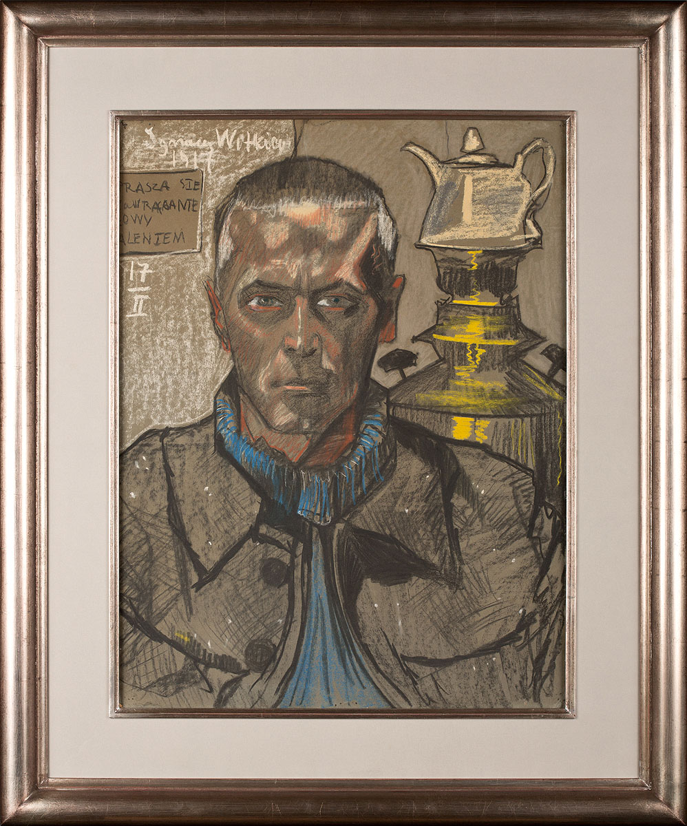 Autoportret z samowarem należy do grupy prac, które Witkacy wykonał w czasie swojego pobytu w Rosji w latach 1914-1918. Z tego okresu zachowało się bogate ouvre artysty składające się z 67 jego prac, w tym – 5 autoportretów, 29 portretów, 26 fantastycznych kompozycji pastelowych, 1 gwaszu, 2 ekslibrisów, 1 okładki książki i 3 obrazów olejnych. Okoliczności znalezienia się w Petersburgu jesienią 1914 roku można nazwać dramatycznymi. Po samobójstwie narzeczonej, Jadwigi Janczewski, Witkacy znalazł się na skraju załamania nerwowego. Chcąc wspomóc przyjaciela Bronisław Malinowski zaproponował mu wyjazd do Australii, gdzie młody antropolog wybierał się na konferencję. Wyruszyli w połowie czerwca zatrzymując się po drodze na Cejlonie. Wspólna podróż została jednak wkrótce przerwana wiadomością o wybuchu I wojny światowej. Witkacy zdecydował się na powrót do Europy lecz jako obywatel rosyjski urodzony w Królestwie Polskim nie mógł wracać do austriackiej Galicji. Pojechał więc do Petersburga gdzie zaciągnął się do ekskluzywnego Pawłowskiego Pułku Lejbgwardii. Służył w niej do 1917 roku kiedy to po rewolucji październikowej rozstał się z armią rosyjską. Właśnie z ostatnich dwóch lat pobytu w Rosji zachowało się najwięcej prac Witkacego. Oferowana praca, powstała w najbardziej tajemniczym i brzemiennym w skutki okresie życia Witkacego, za jaki uważa się czteroletni pobyt w Rosji sposobem i techniką rysowania koresponduje z innymi ówczesnymi dziełami artysty. W tym czasie w swoich portretach i kompozycjach Witkacy używał na równych prawach węgla i pastelu. Do 1914 Witkacy rysował wyłącznie węglem, w 1915, już w Rosji, zaczął do swych prac stopniowo wprowadzać pastel. W 1917 rysunek węglowy służył Witkacemu jeszcze za podstawę kompozycji – szkic konstrukcyjny, uzupełniany stopniowo barwnymi pastelami, służącymi głównie dla ożywienia pracy, podkreślenia jej newralgicznych partii. Witkacy portretował w tym czasie nie tylko siebie – spokojne i obiektywne wizerunki tworzył dla członków petersburskiej Polonii (Stefan Kiedrzyński, Tadeusz Miciński) oraz żołnierzy i ofi cerów Pawłowskiego Pułku. To w Rosji zaczął po raz pierwszy wprowadzać do portretów technikę pasteli, tam również narodził się system, który dał podstawę do późniejszego Regulaminu Firmy Portretowej. Jak pisze Irena Jakimowicz to w „Rosji przyszedł czas syntezy; Witkiewicz zaczął przymierzać swoje malarstwo do swojego o nim myślenia”. A sam artysta przepojony atmosferą rewolucyjną tak pisał: Minęły czasy metafi zycznej absolutności sztuki. Sztuka była dawniej jeśli nie czymś świętym, to w każdym razie „świętawym” – zły duch wcielał się w ludzi czynu. Dziś nie ma w kogo – resztki indywidualizmu życiowego to czysta komedia – istnieje tylko zorganizowana masa i jej słudzy. Od biedy zły duch przeniósł się w sferę sztuki i wciela się dziś w zdegenerowanych, perwersyjnych artystów. Ale ci nikomu już nie zaszkodzą ani pomogą: istnieją dla zabawy ginących odpadków burżuazyjnej kultury.