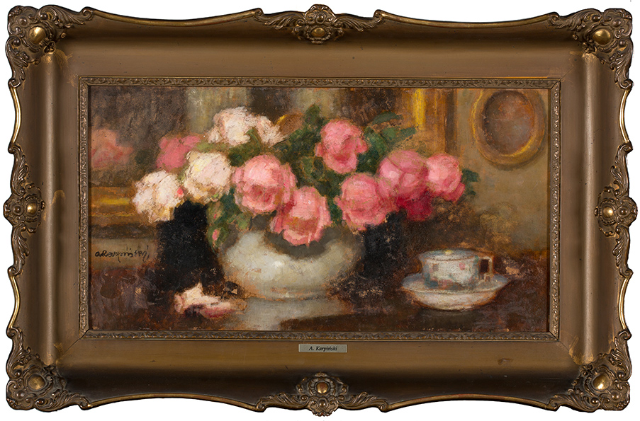 Alfons Karpiński urodził się w 1875 roku w Rozwadowie koło Tarnobrzegu, jako syn Alfonsa Karpińskiego – sędziego powiatowego oraz Barbary Heleny z Pyszów. W 1885 roku, po przejściu ojca na emeryturę, Karpińscy przenieśli się do Krakowa. Tam, jako 15- latek Alfons Karpiński rozpoczął naukę rysunku w miejscowej szkole rzemieślniczej, u Józefa Boguckiego. W 1891 roku rozpoczął studia w Szkole Sztuk Pięknych pod kierunkiem Floriana Cynka, Izydora Jabłońskiego, Władysława Łuszczkiewicza i Leona Wyczółkowskiego. Często również uczestniczył w zajęciach plenerowych z Janem Stanisławskim. W 1903 roku kontynuował naukę w monachijskiej pracowni Antona Ažbégo, następnie w latach 1904-1907 przebywał w wiedeńskiej Akademii Sztuk Pięknych u Kazimierza Pochwalskiego. Lata 1905-1907 to czas rozkwitu krakowskiego kabaretu Zielony Balonik w Jamie Michalikowej, którego Karpiński był jednym z założycieli i czynnych twórców. Przygotowywał dekoracje, poruszał kukiełkami w czasie kabaretów, malował obrazy. W 1907 roku Karpiński wyjechał do artystycznej stolicy Europy – Paryża, gdzie kształcił się w paryskiej Académie Willi. Był członkiem krakowskiego Towarzystwa Artystów Polskich „Sztuka” i warszawskiego TZSP. Podczas I wojny światowej służył w armii austriackiej, po tym jak został ranny przydzielono go do kwatery prasowej z zadaniem rysunkowego dokumentowania wojennych zniszczeń – rysunki te były później wystawiane w TPSP w Krakowie i Wiedniu. Po II wojnie światowej wstąpił do grupy „Zachęta” charakteryzującej się tradycjonalistycznym profilem artystycznym. W początkowym okresie swej twórczości Karpiński malował sceny rodzajowe i miejskie pejzaże – głównie widoki Monachium i Paryża. Popularność zdobył dzięki przedstawieniom martwych natur i portretów zwłaszcza kobiet. Karpiński należy do czołowych reprezentantów nurtu dekoracyjnego w polskim malarstwie początków XX wieku, który bazował na zdobyczach XIX-wiecznego realizmu, wiedeńskiej secesji i Młodej Polski. Głównym tematem jego twórczości stały się martwe natury z kwiatami, przede wszystkim ukochanymi przez artystę różami, cechujące się kolorystycznym wysublimowaniem. Z wielką wrażliwością potrafił Karpiński uchwycić piękno a zarazem przemijalność natury, za co był powszechnie uwielbiany a jego kompozycje rozchwytywane. Wyspecjalizował się również w malarstwie portretowym kobiet. Pozy modelek były najczęściej bardzo proste, poddane młodopolskiej stylizacji. W Paryżu najczęściej portretował swoją ulubioną modelkę Jane – jej oraz innym portretowanym, często aktorkom krakowskim nadawał wyraz „kobiety demonicznej”, wielokrotnie malował również portrety żony. Obrazy te, traktowane płaską plamą, o płynnych konturach i stłumionej gamie barwnej oraz rozproszonym światłocieniem cieszyły się dużą popularnością.
