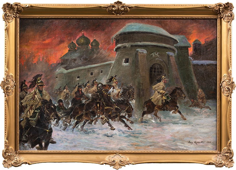 W twórczości Jerzego Kossaka tematyka napoleońska bez wątpienia należała do jednego z ulubionych i najczęściej powtarzanych przez artystę motywów. Kossak posiadał znakomitą znajomość historii i żołnierskich mundurów co pozwalało mu na swobodne i pełne rozmachu przedstawienia epizodów XIX wiecznych wojen. W oferowanym obrazie Kossak ukazał Napoleona jadącego saniami w otoczeniu polskich żołnierzy 1 Pułku Szwoleżerów-Lansjerów Gwardii Cesarskiej, którzy wrześniowym rankiem 1812 roku wyprowadzili cesarza z płonącego miasta. Podczas odwrotu w drugiej połowie października rozpoczęły się silne mrozy i zamiecie śnieżne, które zdziesiątkowały wojsko i ostatecznie przyczyniły się do jego klęski. Udział Polaków walczących u boku Napoleona o być albo nie być Ojczyzny pozostał jednak powodem do dumy i chwały. Byli najlepiej przygotowani do trudnych warunków a ich poświęcenie pozwoliło uratować wielu ludzi, w tym samego Napoleona. Nie bez przyczyny motyw ten podejmuje Kossak w 1922 roku – dwa lata po zwycięskim odparciu najazdu bolszewików w 1920 roku. Potrzeba wskrzeszania i nieustannego pielęgnowania pamięci o polskich sukcesach militarnych była niezwykle silna w narodzie, który tylko kilka lat wcześniej odzyskał upragnioną suwerenność. Miejscu Moskwy w świadomości narodowowyzwoleńczej Polaków jest wyjątkowe. To nie tylko zwycięstwo w wojnie polsko bolszewickiej zwane Cudem nad Wisłą i nie tylko kampania napoleońska z 1812 roku ale również triumf sprzed dwustu lat wcześniej – a mianowicie zdobycie Moskwy w 1612 roku stanowiły o specjalnym traktowaniu relacji polsko – rosyjskich przez takich artystów jak Kossakowie. W tym względzie nie do przecenienia zdają się być zasługi jakie malarstwo Jerzego i jego ojca Wojciecha miało dla podtrzymania i pielęgnowania dumy narodowej. Artysta malował tę scenę przynajmniej raz jeszcze, w roku 1929 zbiory MNW; porównaj: K. Olszański, Jerzy Kossak, Wrocław-Warszawa- -Kraków 1992, 51.