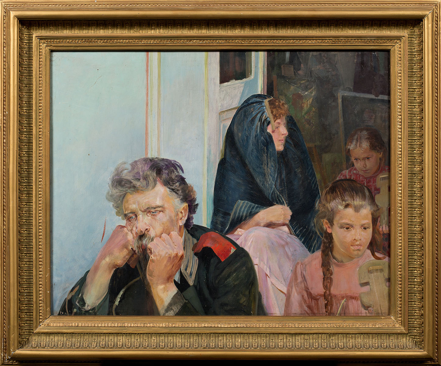 Prezentowana praca, pojawiająca się na rynku antykwarycznym po raz pierwszy, jest niezwykle ciekawą i bogatą w wątki kompozycją Jacka Malczewskiego. Scena koncentruje się wokół wyraźnie zarysowanych postaci siedzących w otwartych drzwiach jakimi są sędziwy żołnierz z głową podpartą rękoma, na drugim planie kobieta w zapasce na głowie zwrócona w przeciwną stronę z półprzymkniętymi oczyma oraz dwie dziewczynki z instrumentami smyczkowymi w dłoniach wychodzące z wnętrza domu w kierunku widza.