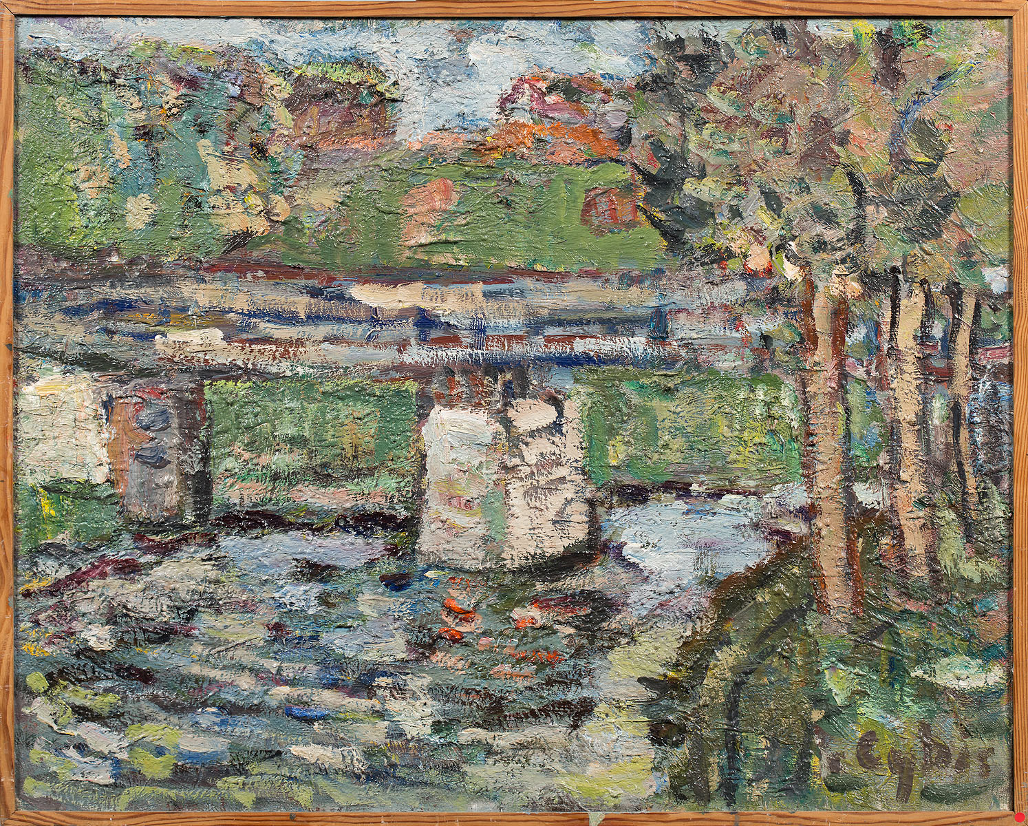 sygn. p.d.: Cybis, opisany na odwrocie:65 x 81 / JAN CYBIS - WARSZAWA / ul. Karowa 14 / "Most na Popradzie"1964 r. KAT M.N. 400, na blejtramie: Jan Cybis Most na Popradzie 1959, na odwrocie nalepka wywozowa