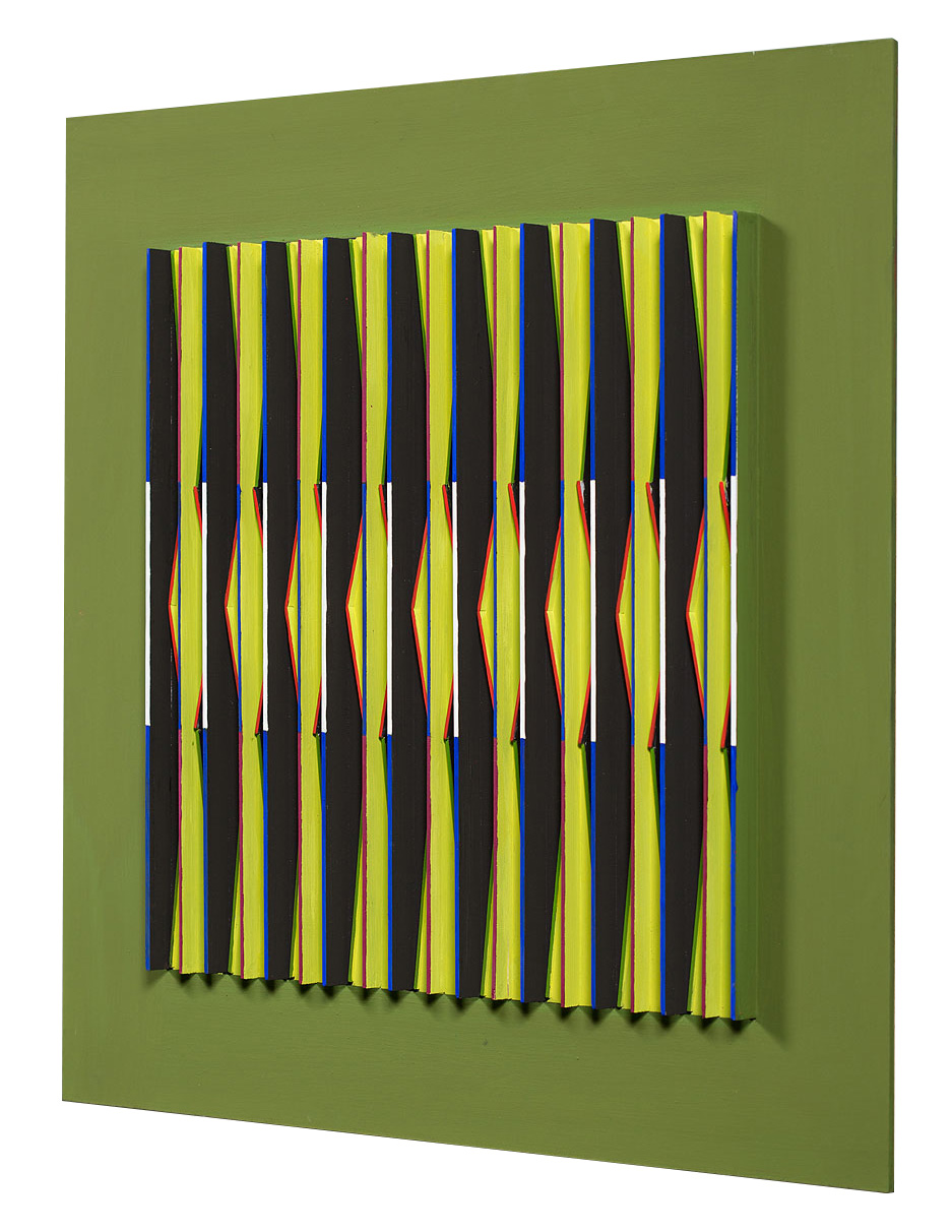 Andrzej Nowacki jest artystą kojarzonym z op-artem. Od 1988 roku w swojej sztuce posługuje się językiem geometrii, tworząc barwne reliefy. Jego charakterystyczne prace nie sposób przypisać komukolwiek innemu. Realizując kwadratowe kompozycje skonstruowane z rytmicznych trójwymiarowych linii, zaprasza widza do kreowania własnego doświadczenia wizualnego. Poszczególne listewki, pomalowane różnokolorową farbą, wywołują zmienne efekty w zależności od punktu obserwacji i naszego ruchu. Raz kompozycja może jawić się jako niebieska, a pod innym kątem będzie z kolei czerwona. Pełne doświadczenie wizualne uzyskamy przemieszczając się wzdłuż obrazu. Kolory zaczną wówczas wibrować, zmieniać się i odkrywać przed nami swoje nowe kolejne oblicza. Nowacki opanował niezwykłą umiejętność poruszenia statycznego reliefu i nadania mu iluzji ruchu. Sam artysta wypowiadał się o swoich pracach: „Podstawową wartością w mojej pracy twórczej jest kolor. (…) W dialogu z odbiorcą tworzy słowa języka nieświadomego, jest źródłem energii. (…) W czasie powstawania obrazu kombinacje kolorów i ich odcieni krystalizują się w strumieniu odczuwania emocji. Tonacje barw są kreowane wzruszeniem, działają bezpośrednio, bez barier myślowych, nie ma tu dystansu, kalkulacji i rozważań. Geometryczne ograniczenie barw na zrównoważonej płaszczyźnie kwadratu, rozdzielenie ich linią powoduje wewnętrzną wibrację i napięcia, wywołuje emocje, które są bardziej swobodne (…). Chwila, w której namalowany obraz zaczyna samodzielnie istnieć, szukając swojego miejsca w dialogu z odbiorcą, to moment najistotniejszy” (Nowacki A., Szepty barw, tekst autorski artysty). Kompozycje Nowackiego stanowią bezustanne źródło niespodzianek, odkryć i inspiracji. Posługując się językiem koloru, zapraszają do dialogu i kontemplacji – by choć na chwilę oderwać się od powszedniości życia i zatracić w wzruszających podszeptach barw.