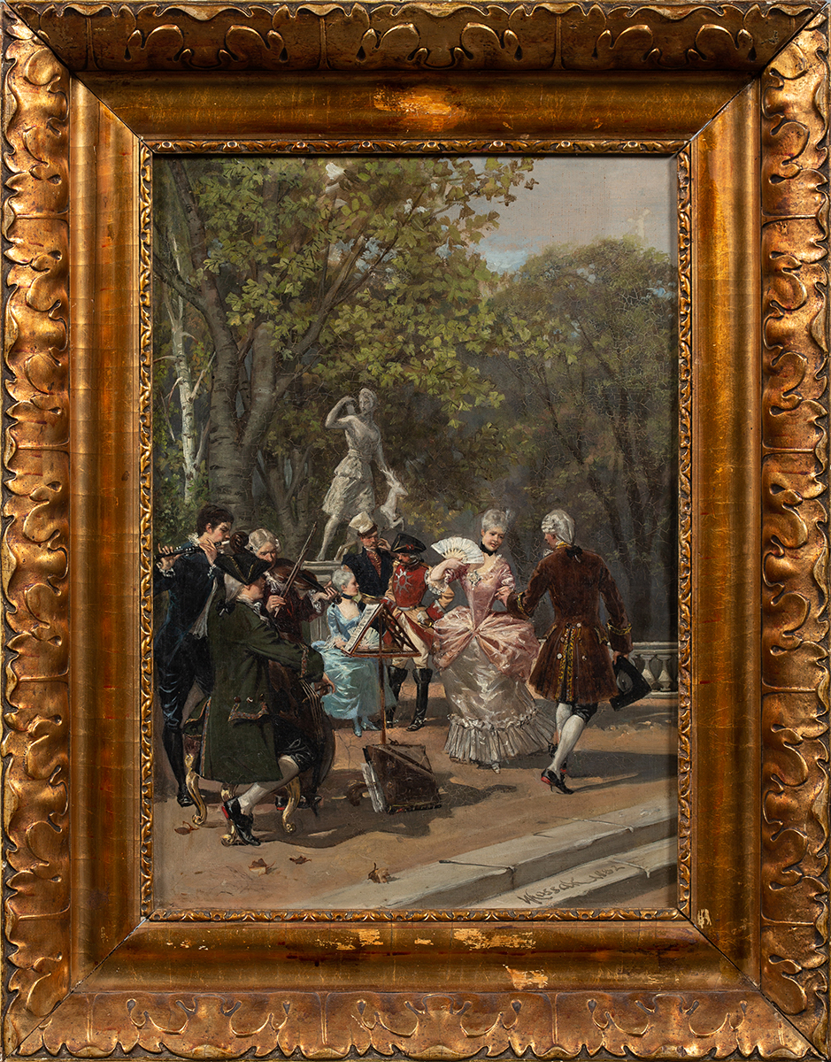 Wojciech Kossak we wczesnym okresie swej twórczości podpisywał swe obrazy w ligaturze łączącej inicjał imienia z pierwszą literą nazwiska. Umieszczony na opiniowanym obrazie podpis – malowany szarą farbą, tą samą która pojawia się w palecie barw dzieła – jest złożony ręką samego Wojciecha Kossaka. Obraz o umownym tytule „Zabawa w ogrodzie w manierze fête galante” z 1882 roku jest nieznaną dotychczas w literaturze pracą Wojciecha Kossaka, którego artystyczne oeuvre jest jeszcze nie do końca poznane. Wiele prac artysty znajduje się w zbiorach prywatnych, a wczesne prace z okresu paryskiego, a następnie berlińskiego są poza granicami Kraju. Ceniony za życia, płodny w swej twórczości tworzył liczne sceny batalistyczne, portrety, sceny rodzajowe, historyczne, ale scena rodzajowa w kostiumie XVIII wieku należy do rzadkości w dziele Wojciecha Kossaka.