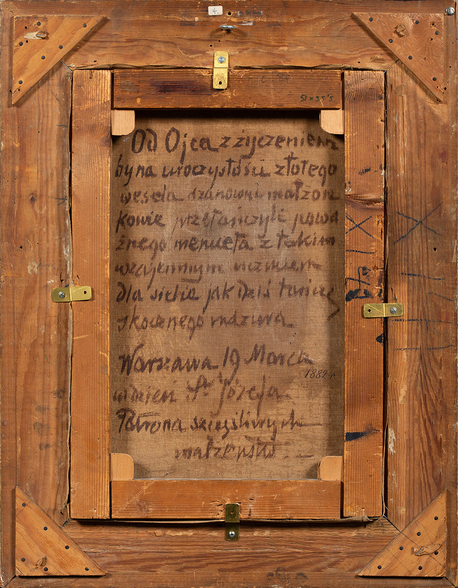 sygn.p.d: WKossak 1882, na odwrocie odręczna dedykacja: Od Ojca z życzeniem by na uroczystości złotego wesela szanowni małżonkowie przetańczyli poważnego menueta z takim wzajemnym uczuciem dla siebie jak Dziś tańczą skocznego mazura. Warszawa 19 Marca w dzień Św. Józefa Patrona szczęśliwych małżeństw (do obrazu dołączono ekspertyzę Adama Konopackiego z 2019 roku)