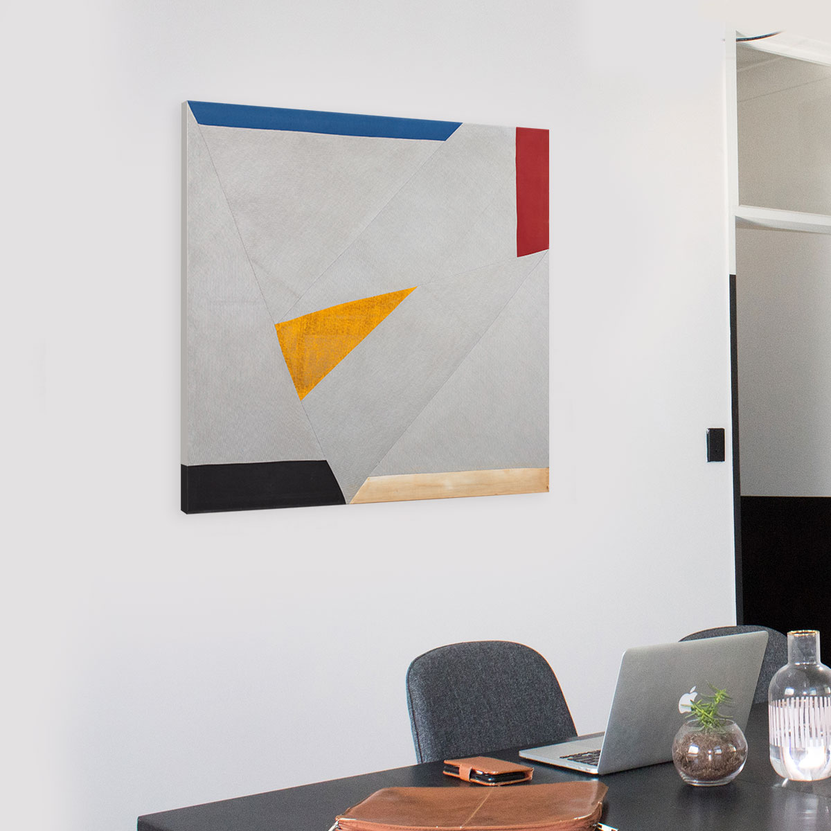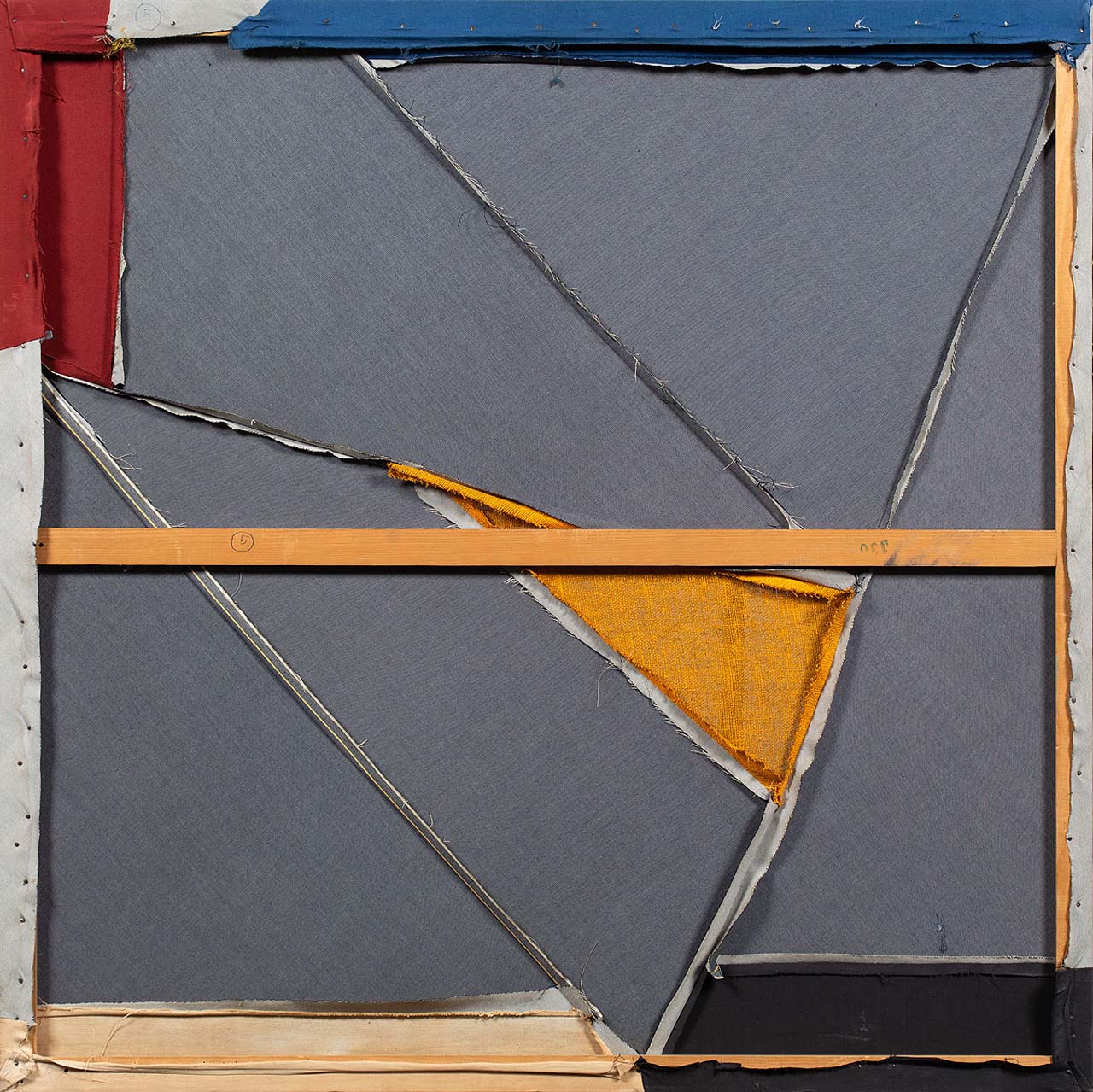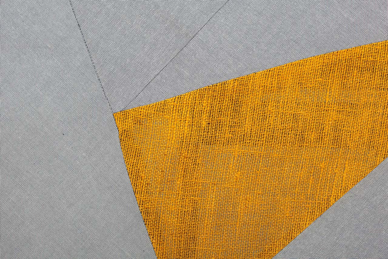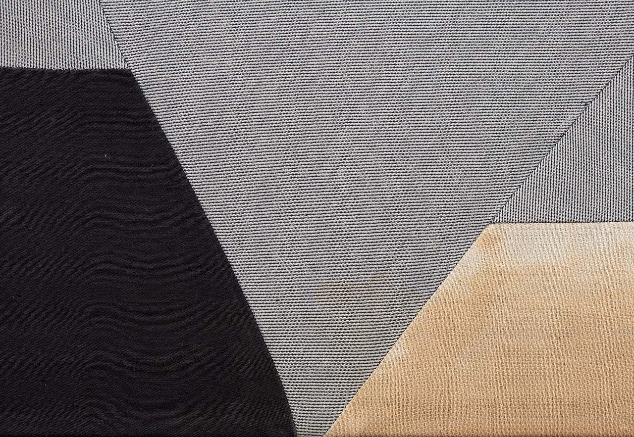 technika własna, bawełna i len ręcznie barwione, w prawym dolnym rogu interwencja chemiczna / 129,5 x 129,5