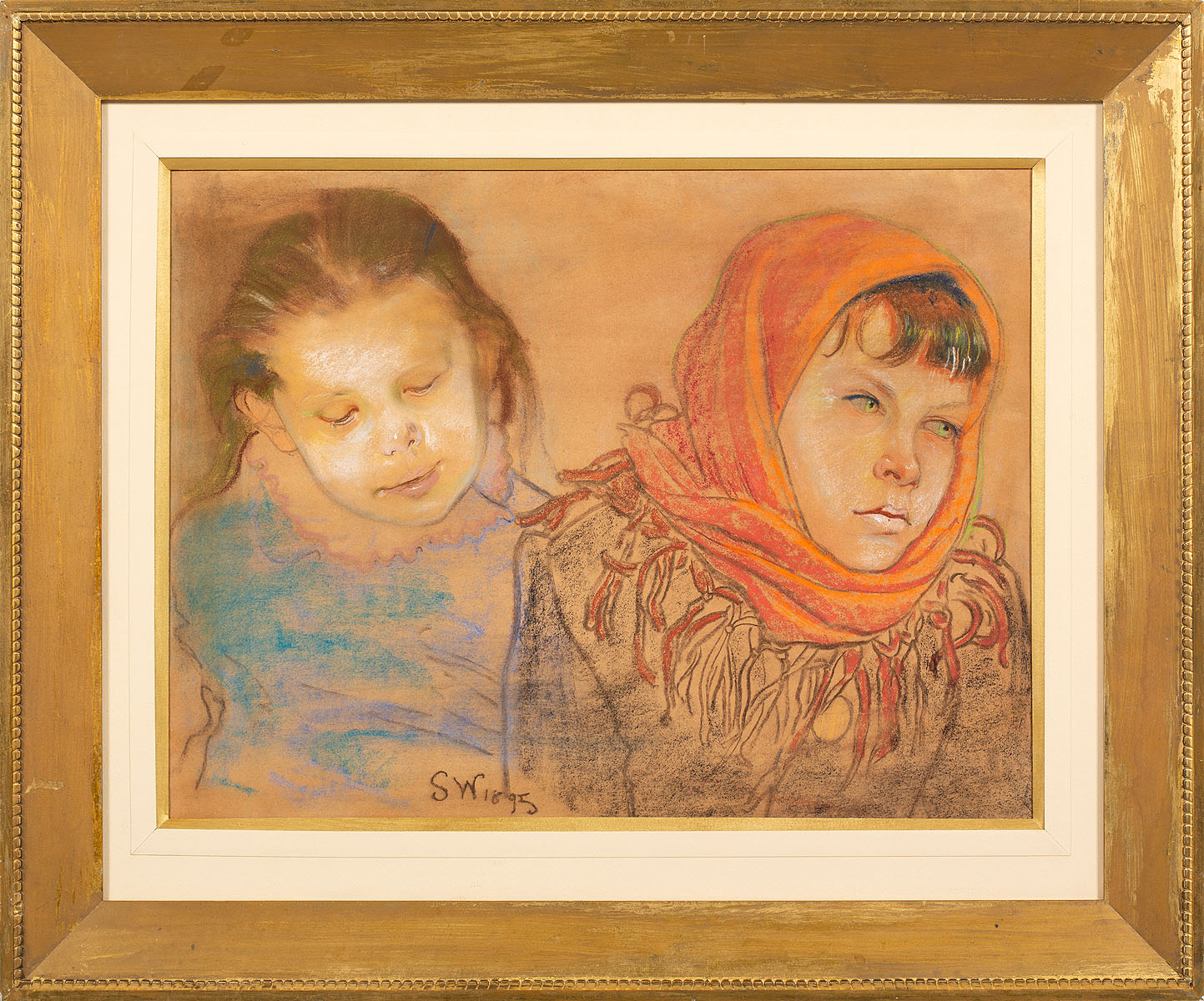 Prezentowany obraz przedstawia portret dwóch dziewczynek w wieku około czternastu i siedmiu lat. Starsza z nich znajdująca się po prawej stronie ma na głowie ciasno zawiązaną chustę z dekoracyjnymi frędzlami. Dziecko ma charakterystycznie podniesione ramiona w geście obrony przed zimnem i trochę zaczerwieniony nosek. Młodsza jest pogodna, ma lekko przymrużone oczy i wydaje się figlarnym, trochę łobuzerskim, niezwykle ujmującym dzieckiem. Praca stworzona jest zdecydowaną i ekspresyjną kreską, z charakterystycznym dla artysty pominięciem jakiegokolwiek rekwizytu mogącego rozpraszać widza. Portret uchwycony jest również w typowym dużym zbliżeniu, z zastosowaniem swoistego kadru, pozwalającego na skupienie się głównie na twarzach dziewczynek. A jednak jeśli chcemy dalej się przyglądać to dojrzymy precyzyjny rysunek frędzli na chuście, piękny zarys linii włosów młodszej dziewczynki i wiele innych detali, stanowiących o klimacie tak ważnym w pracach Wyspiańskiego. Ze wszystkich prac portretowych dzieci Stanisława Wyspiańskiego bije ciepło i miłość. Secesyjna linia nadaje im coś w rodzaju miękkości, które przy dosyć prostych, nieprzeładowanych kompozycjach niezmiennie ujmują odbiorcę.
