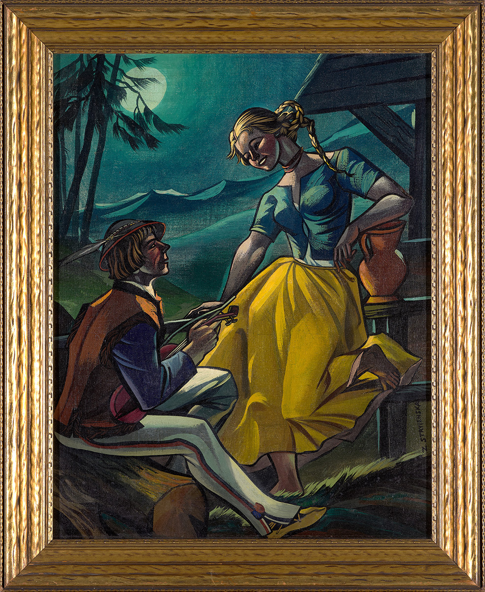 Określana mianem „pierwszej damy polskiego malarstwa dwudziestolecia międzywojennego” czy wręcz „księżniczki malarstwa polskiego”. Zofia Stryjeńska – malarka i ilustratorka, plakacistka, scenografka, znana z kontrowersyjnego, pełnego fantazji stylu bycia. Jej twórczość została głęboko zakorzeniona w formach zaczerpniętych ze sztuki ludowej. Umiejętnie łączyła rysunek z malarstwem, pracując w różnych technikach – od olejów, poprzez gwasze i tempery, na akwareli kończąc. Stosowała czyste, ostre barwy i lekko geometryzujące formy w stylu art-deco, gdzie tematem kompozycji był zawsze polski folklor – obrzędy, tańce i stroje.