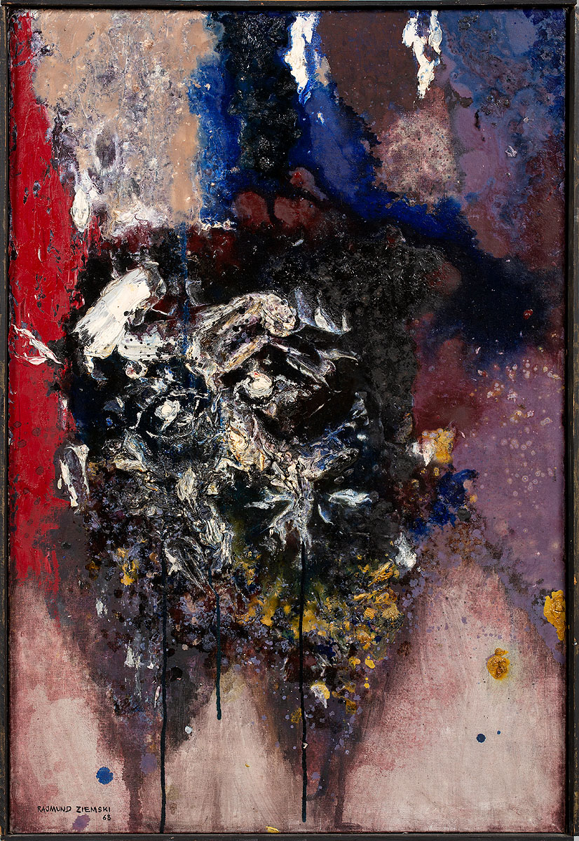 Rajmund Ziemski urodził się w 1930 roku w Radomiu. W latach 1949-1955 studiował na warszawskiej ASP pod kierunkiem Artura Nacht-Samborskiego. Zadebiutował podczas Ogólnopolskiej Wystawy Młodej Plastyki – „Przeciw wojnie – przeciw faszyzmowi”, która odbyła się w warszawskim Arsenale. Po czasie „odwilży” związał się z grupą artystów, skupionych w kręgu prowadzącego galerię „Krzywe Koło” Mariana Bogusza. Największy wpływ na styl Ziemskiego miał okres nauki oraz współpraca ze wspomnianym wcześniej Nacht-Samborskim, przedstawicielem szkoły kapizmu. Owa współpraca wytworzyła w nim wysoką wrażliwość kolorystyczną. Innym istotnym elementem twórczości artysty był wpływ malarstwa z gatunku informel. Właśnie w tym stylu tworzył od końca lat 50., co uczyniło go jednym z głównych przedstawicieli tego kierunku w kraju. Artysta wspominał: „W okresie Arsenału, a zresztą i później w latach 56 i 57, moje obrazy bliskie były malarstwu figuratywnemu; obracałem się w świecie realiów znanych, realia te wystarczały jeszcze treściom, które chciałem przekazać. Ale z czasem okazało się, że dla spraw, jakie mam do powiedzenia, dla treści, jakie chcę w swoich obrazach zamknąć, muszę znaleźć formy będące czymś w rodzaju syntezy, formy obiektywnie kreujące, a nie powtarzające otaczający świat; formy, których sugestywność odpowiadałaby zamierzanemu celowi. Inspiracji szukałem w pejzażu” (Rajmund Ziemski. Malarstwo, Akademia Sztuk Pięknych, Zachęta Narodowa Galeria Sztuki, Warszawa 2010, s. 105).