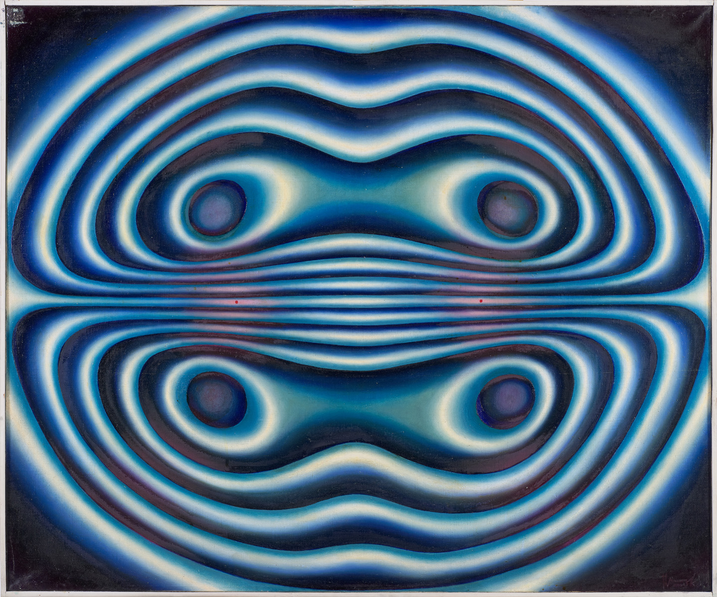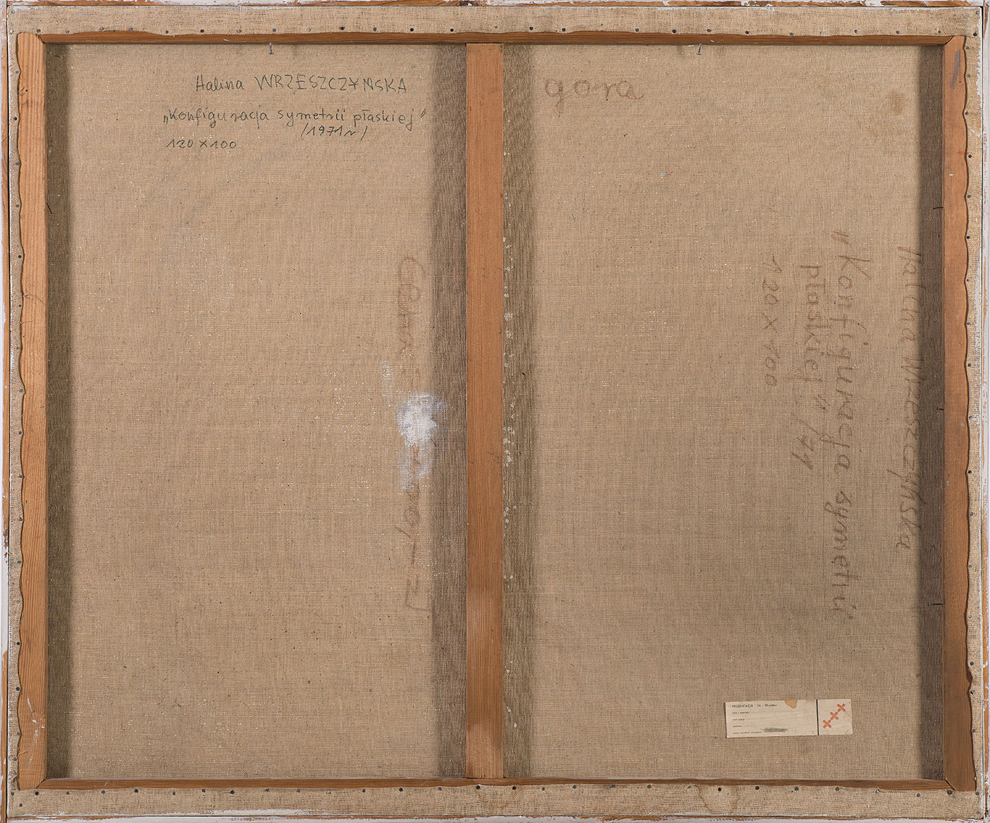 sygn. dwukrotnie na odwrocie: Halina WRZESZCZYŃSKA „Konfiguracja symetrii płaskiej" /1971r/ 120 x 100 oraz Halina Wrzeszczyńska „Konfiguracja symetrii płaskiej"/ 71 120 x 100, na odwrocie nalepka z opisem pracy z wystawy Prezentacje z 1974 roku we Wrocławiu