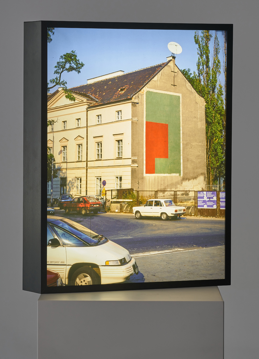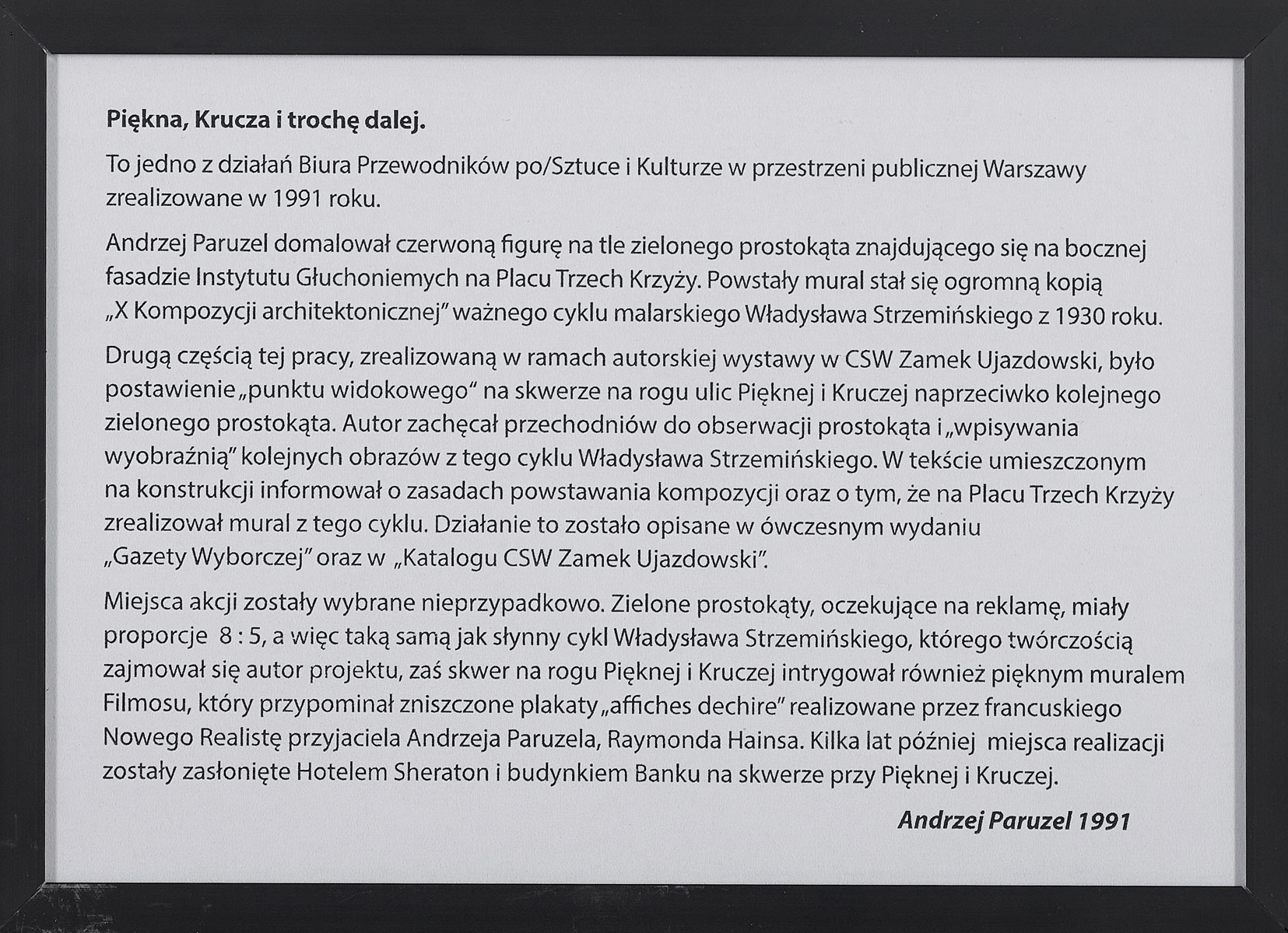 W 1930 Władysław Strzemiński stworzył cykl malarski „X Kompozycji architektonicznych”. Były to obrazy abstrakcyjne ograniczone do dwóch płaszczyzn kolorów. Andrzej Paruzel w 1991 roku wykorzystał ten motyw jako jedno z działań Biura Przewodników po Sztuce i Kulturze w przestrzeni Warszawy na Placu Trzech Krzyży. Na bocznej fasadzie Instytutu Głuchoniemych znajdował się namalowany duży zielony prostokąt, który pierwotnie był miejscem przeznaczonym na reklamę. Jego proporcje były 8:5 czy dokładnie takie same jak płótna kompozycji architektonicznych Strzemińskiego. Andrzej Paruzel znając twórczość Łódzkiego artysty postanowił domalować czerwoną fi gurę do gotowego muralu, aby w ten sposób powstała ogromna kopia „X Kompozycji architektonicznej”. Drugą częścią tej pracy, zrealizowaną w ramach autorskiej wystawy w CSW Zamek Ujazdowski, było postawienie „punktu widokowego“ na skwerze na rogu ulic Pięknej i Kruczej naprzeciwko kolejnego zielonego prostokąta naprzeciwko kolejnego zielonego prostokąta. Autor zachęcał przechodniów do obserwacji prostokąta i „wpisywania wyobraźnią” kolejnych obrazów z tego cyklu Władysława Strzemińskiego. W tekście umieszczonym na konstrukcji informował o zasadach powstawania kompozycji oraz o tym, że na Placu Trzech Krzyży zrealizował mural z tego cyklu. Działanie to zostało opisane w ówczesnym wydaniu „Gazety Wyborczej” oraz w „Katalogu CSW Zamek Ujazdowski”. Niestety obecnie nie można już oglądać muralu na budynku Instytutu dla Głuchoniemych, ponieważ został on zasłonięty przez wybudowany Hotel Sheraton. Dzięki prezentowanej instalacji, która składa się ze zdjęć oraz tekstu dokumentującego działania z 1991 roku, możemy zobaczyć jak wyglądała wielka kopia „X kompozycji architektonicznej” i ujrzeć ją w kolejnej odsłonie.