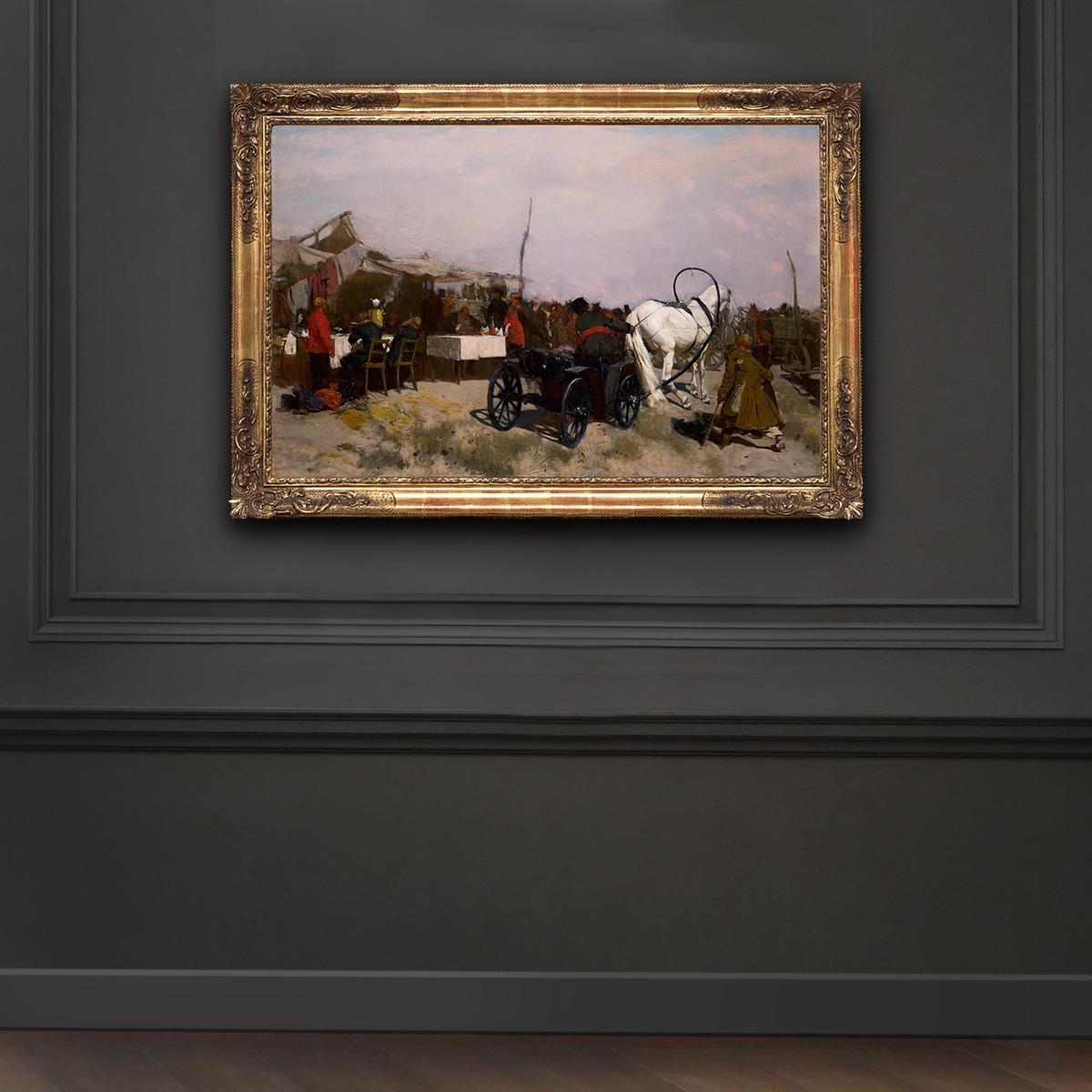 Historycy sztuki zgodnie twierdzą, że takie odwrócenie się od tego co niesie ze sobą czas w sztuce było ryzykowne i że unieść mógł je tylko prawdziwy talent, oparty na niepodrabianym, niepowtarzalnym autentyzmie. Możemy dziś podziwiać rzeczywiście oddzielny, swoisty tylko dla polskiej kultury charakter prac, prawdziwy, rasowo polski temperament. Fenomenem jest, że prace Chełmońskiego tego typu cieszyły się ogromnym powodzeniem handlowym w całej Europie. Kupowali je zagraniczni kolekcjonerzy również zza oceanu doceniając niesamowity warsztat malarski, ale przede wszystkim klimat. Pomogła w tym zapewne bardzo korzystna dla artysty umowa z marszandem Goupilem oraz złoty medal na wystawie światowej w1889 roku. Jeśli jednak zaznajomimy się bliżej ze wspomnieniami Chełmońskiego, z listami, które pisał do swoich mentorów z Paryża, to dowiemy się, że najwięcej artysta zaczerpnął ze wschodnich kresów Polski. To na Ukrainie zbliżył się bezpośrednio do natury, będąc prawdziwie zachwyconym kresowym rozmachem życia i bezbrzeżną stepową przestrzenią. Obserwacje z podróży na Ukrainę uczyniły go niezrównanym znawcą i malarzem rozhukanych koni kresowych, zaprzęgów i scen z życia codziennego wsi ukraińskiej. Obrazy, które były tam jego udziałem wryły się na stałe w pamięć i niejednokrotnie artysta w późniejszym okresie po mistrzowsku wykorzystywał zapamiętane typy i motywy ukraińskie. Jak określić więc kierunek w jakim tworzył Chełmoński? Niewątpliwie bliżej artyście do realizmu niż do idealistycznie nastrojonego liryka. Nie był to jednak suchy, fotograficzny realizm. Do tego odwołuje się Maciej Masłowski porównując prezentowana pracę do impresjonistycznego Targu na kwiaty Pankiewicza, czy dalej – do malarstwa Maneta. Chełmoński mógłby nie być do końca zadowolony. Wiemy jak bardzo zależało mu na niezależności twórczej. Ale rzeczywiście trudno nie zwrócić uwagi na charakterystyczne rozmieszczenie białych plam – konia i obrusów, scenerię jaką tworzą dachy nad stołami i grę świateł. Naturę bardzo trudno oszukać, a w Chełmońskim tkwiła jednak od zawsze dusza wielkiego poety. To sprawiało, że wypowiadał się językiem środków wprawdzie realistycznych, ale tworzył trudny do opisania w słowach czar zatrzymanej chwili codzienności, można by nazwać czar swojskości. Chcąc, nie chcąc musiał użyć do tego środków odzwierciedlających impresję. Niemal słyszymy jarmarczny zgiełk, nawoływania, czujemy upał i zapachy od – dychającego, żyjącego targu. Tego nie potrafiłby zrobić zwykłe realista. To domena prawdziwego wirtuozera, plastyka płótna, czarodzieja.