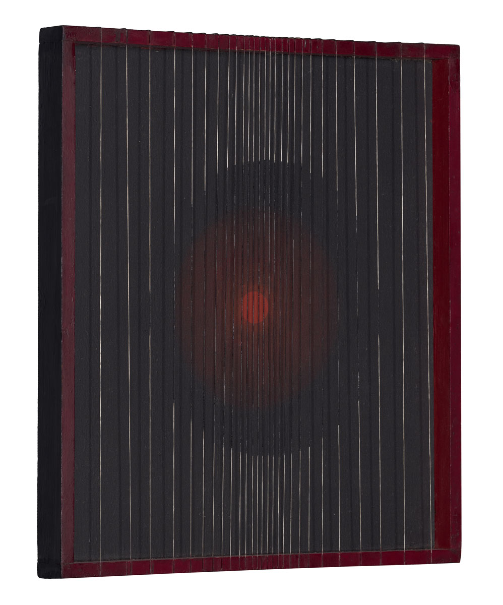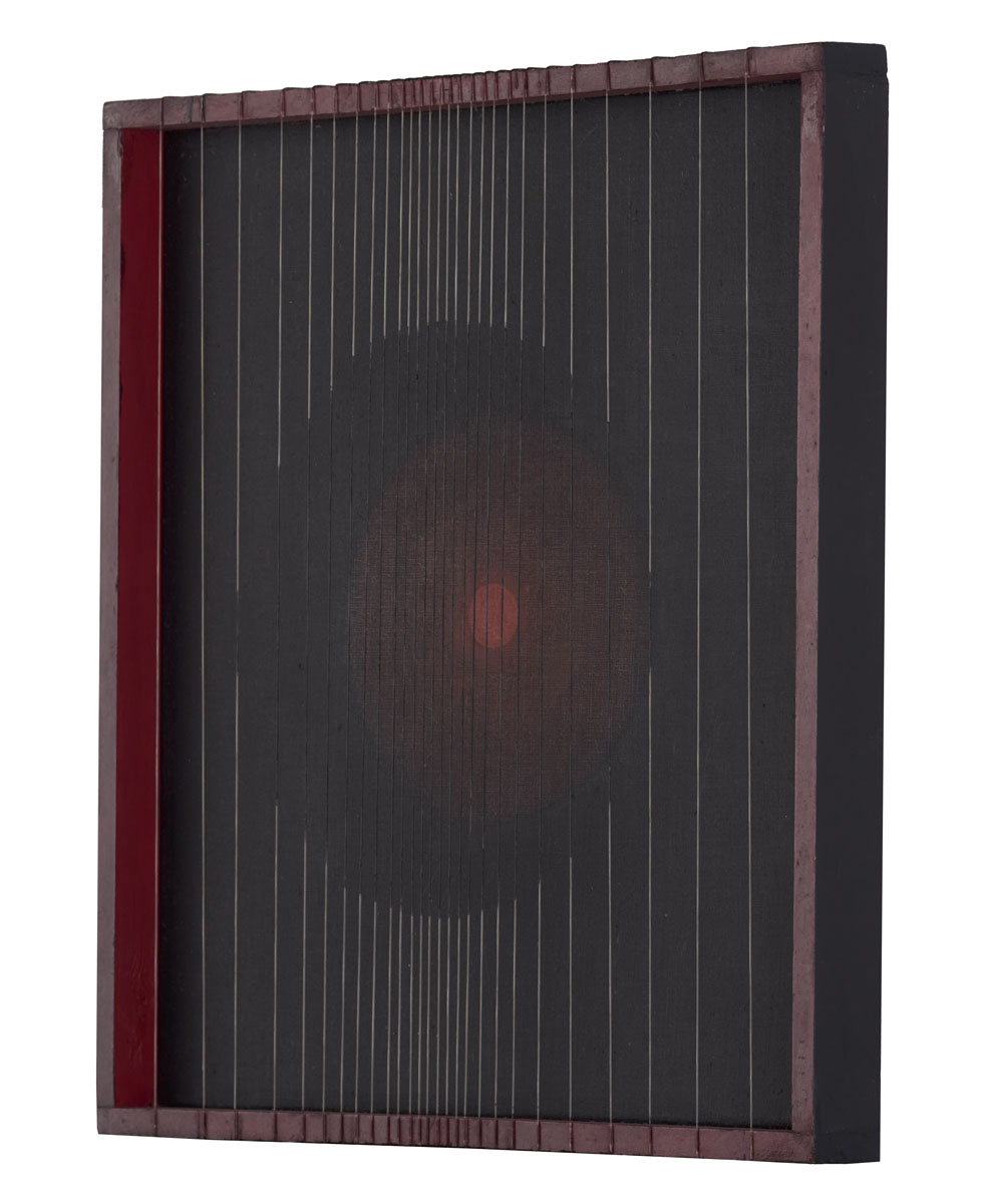 Danuta Lewandowska urodziła się w 1927 roku w Warszawie. W latach 1950-55 studiowała na Akademii Sztuk Pięknych w Warszawie. Od 1958 roku była adiunktem w Pracowni Brył i Płaszczyzn na Wydziale Malarstwa rodzimej uczelni pod kierunkiem profesora Romana Owidzkiego. Projektowała wnętrza, tkaniny, ale to jej twórczość malarska zyskała największe uznanie i dotąd jeszcze nie w pełni odkryta czeka na swoje zasłużone wysokie miejsce. Lewandowska bowiem uczestniczyła w życiu intelektualnym czołowych ówczesnych twórców, pozostawała w przyjaźni m.in z Henrykiem Stażewskim. Szczyt jej twórczej dojrzałości przypada na lata 70-te. Z tego to okresu pochodzą prace o charakterystycznym wyrazie: przed właściwą powierzchnią obrazu znajduje sie kolejna płaszczyzna z naciągniętych i pomalowanych metalowych strun. Można powiedzieć, że są to obrazy dwuwarstwowe. Magia tej twórczości polega na tym, że przechodząc koło obiektu widz ma wrażenie przesuwania się płaszczyzn wobec siebie, odbierając przy tym efekt świetlny bądź częściej wrażenie pulsowania świetlistych kół namalowanych na pierwszej płaszczyźnie. Twórczość tej artystki jest przedziwnym połączeniem geometrii jej okręgów z nurtem op-artowskim, przejawiającym się w efektach wizualnych. Henryk Stażewski określił to chyba najpiękniej, mówiąc o malarstwie Lewandowskiej: doprowadza materię do stanu krańcowej wibracji. Motywem ciekawym i łączącym niejako większość prac artystki jest motyw okręgu. Być może można go łączyć ze sztuką i filozofią Dalekiego Wschodu, którą żywo się interesowała. Na interpretację czeka też charakterystyczna przezroczysta, ulotna zasłona która dzieli odbiorcę od właściwego obrazu. Prace Lewandowskiej tchną niesamowitym spokojem, skłaniają do medytacji, uspokajają przestrzeń, w której się znajdują, a jednocześnie w żaden sposób nie są nudne, wręcz przeciwnie: nie sposób przejść obok nich obojętnie.