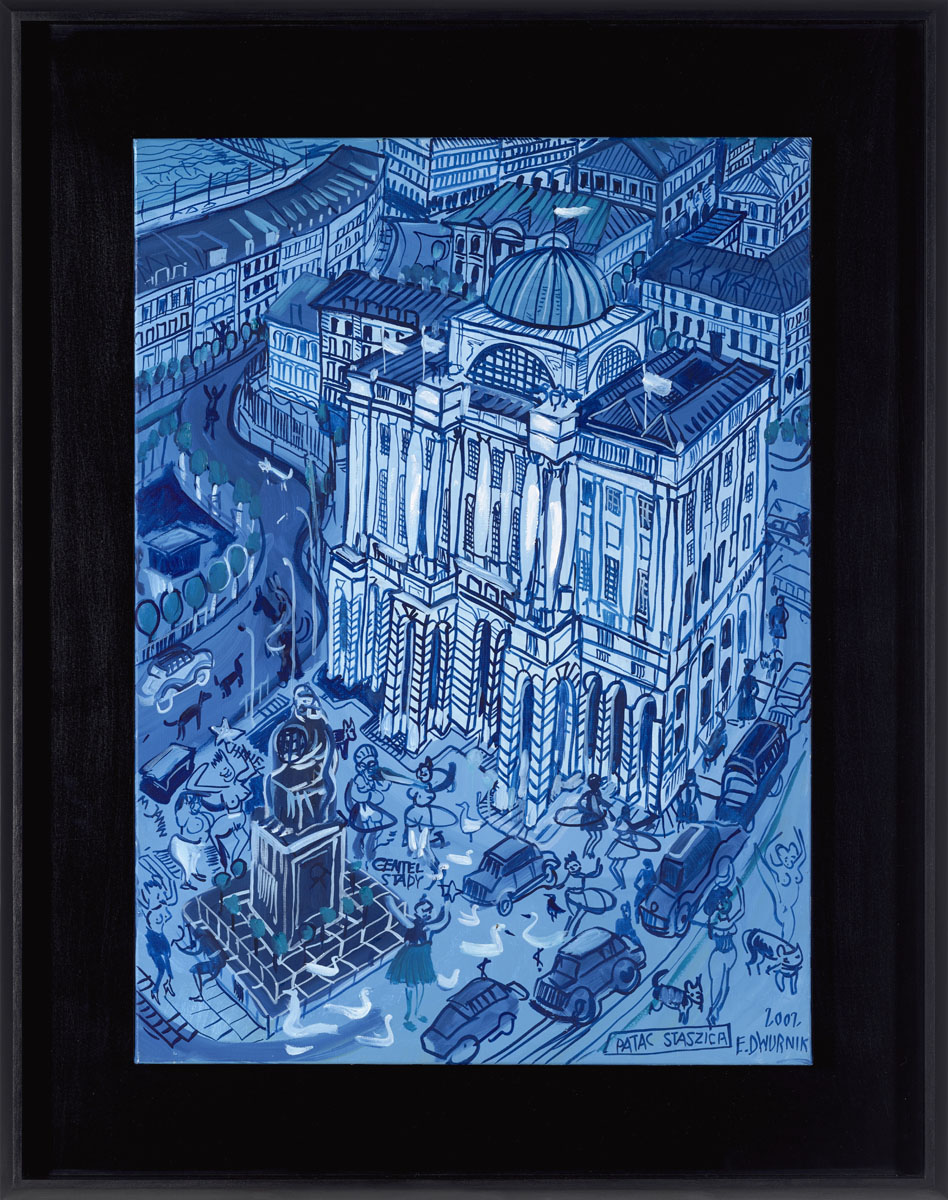 Edward Dwurnik był wybitnym polski malarzem i grafikiem. W latach 1963-1970 studiował na Akademii Sztuk Pięknych w Warszawie, na Wydziale Malarstwa, Grafiki oraz Rzeźby. W 1965 roku rozpoczął swoją słynną serię widoków miast zatytułowaną „Podróże autostopem”. Później stworzył jeszcze kilka innych cykli, jak „Sportowcy” (1972-1978) ukazujący bohaterów zwykłej PRL-owskiej codzienności w komiksowo-karykaturalny sposób, upamiętniającą ofiary stalinizmu „Drogę na Wschód” (1989-1991) czy cykl „Od Grudnia do Czerwca” (1990-1994) poświęcony okresowi stanu wojennemu w Polsce. W jego twórczości znaleźć można także obrazy niezaangażowane, np. cykl mocno awangardowych morskich pejzaży pt. „Błękitne” (lata 90.) lub barwnych abstrakcji w technice action painting pt. „Dwudziesty piąty”. Inne serie to m.in. „Portret”(od lat 70.), „Robotnicy” (lata 80.), „Niech żyje wojna!” (1991-1993), „Niebieskie miasta”(od 1993), „Diagonalne” (od 1996) czy „Wyliczanka”(od 1996).