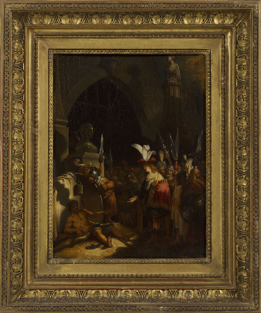 Temat aleksandryjski rozwinął Norblin w innej akwaforcie zatytułowanej „Aleksander Wielki i Diogenes” a kompozycję tę powtórzył w oferowanej tu olejnej pracy. Bohaterem jej jest Diogenes z Synopy, filozof, najpopularniejszy przedstawiciel szkoły cyników, który wyrzekł się wszelkich cywilizacyjnych dóbr materialnych i zamieszkał w beczce. Silnie lansowany w epoce oświecenia wzorzec moralny, którego głównym piewcą był Jan Jakub Rousseau, zakładał przeciwstawienie się zepsuciu współczesnej cywilizacji i powrót do życia zgodnego z naturą. Wzorzec podany przez postać antycznego filozofa współgra z zasadami przyjętymi przez czołowych francuskich artystów doby klasycyzmu, którzy wyrażali problemy epoki używając przenośni starożytnych. Akwaforta Jana Piotra Norblina nie jest datowana ale, jak stwierdza Alicja Kępińska w monografii artysty, możemy w przybliżeniu określić czas jej powstania wedle jednego z dwóch szkiców o tym samym temacie, noszącego datę 1786 (Kępińska A., Jan Piotr Norblin, Zakład Narodowy im. Ossolińskich, Wrocław 1978, s. 30). Biorąc pod uwagę fakt, że – według Alicji Kępińskiej – artysta niejednokrotnie wykonywał rycinę na podstawie namalowanego przez siebie wcześniej obrazu, można w przybliżeniu datować oferowaną olejną pracę na 1786 rok.