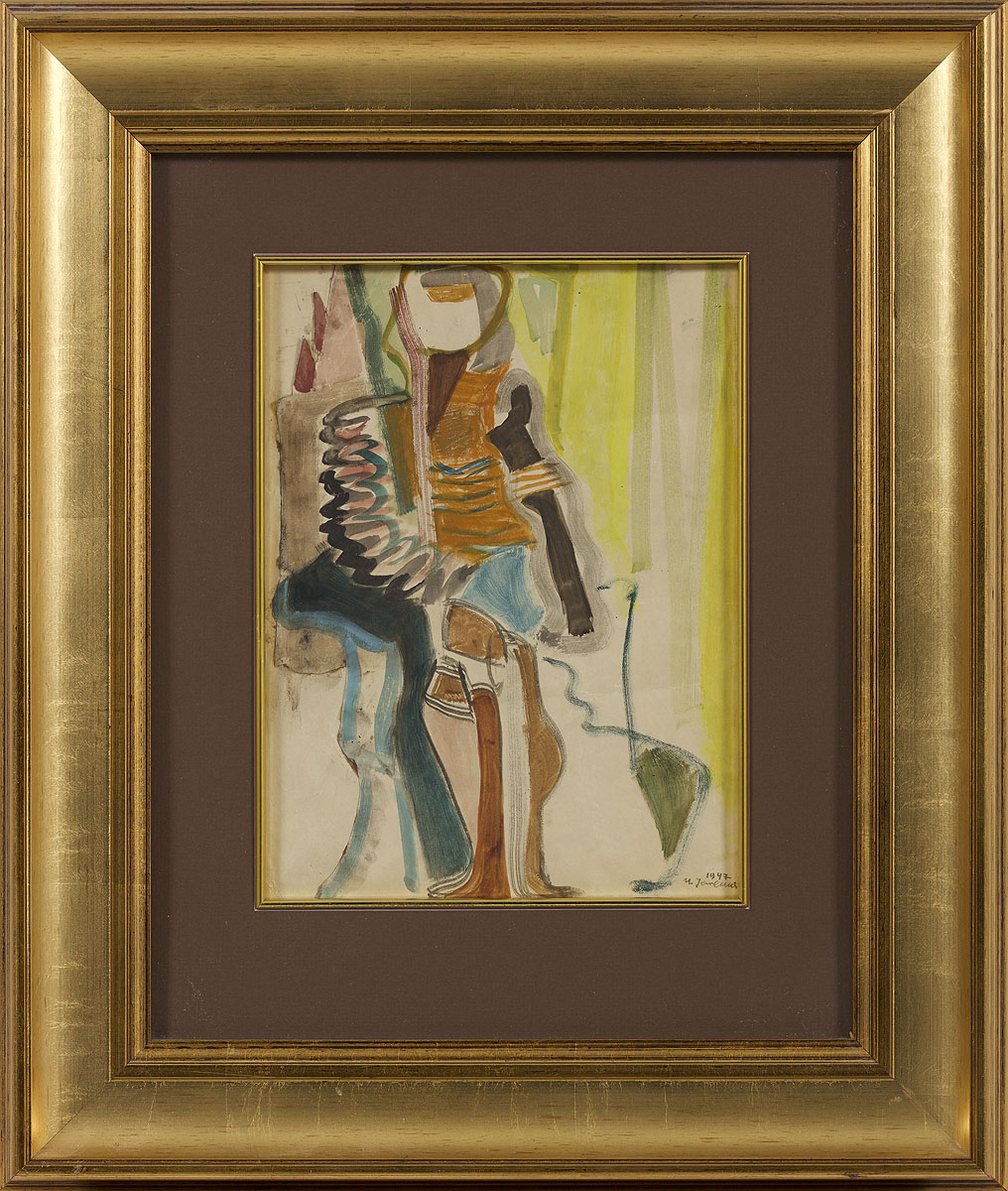 Pokłosiem paryskich doświadczeń stały się obrazy wyraźnie zmierzające ku abstrakcji. Fascynujący Jaremę człowiek i jego relacja z otaczającym światem wysuwają się na pierwszy plan. Pod koniec lat 40., zwłaszcza zaś w obrazach z 1948 roku, figura ludzka sprowadzona zostaje do zaledwie elementu gry plastycznej. Zanika ona w kompozycjach złożonych z plam o geometryczno-organicznych kształtach, znamionujących wpływ sztuki Picassa. Segmentowe formy otoczone są wyraźnym konturem i zróżnicowane barwą. Z początku materia malarska była jeszcze ciężka, z czasem jednak nabrała przezroczystości przypominającej witraże. Jarema daleka była od abstrakcji geometrycznej, w jej malarstwie ślad natury pozostawał stale obecny. Obrany język abstrakcji służył artystce do badania przestrzeni i efektu dynamiki w obrazie. Kontynuowała go w cyklach „Postacie”, „Akty”, „Głowy” i „Chwyty” powstających w latach 1951-56. Niezmiennie intrygowała ją postać ludzka, jej miejsce w przestrzeni, a także przedstawienie ruchu w obrazie. Artystka pisała, że „należy poszukiwać doskonałego rytmu form, żeby dać człowiekowi poczucie współistnienia z otaczającymi go światami, z ich ustawicznym ruchem zmian” (Jaremianka, Kraków – Katowice 2019, s. 17). Poszukując owego doskonałego rytmu do końca życia, Jarema balansowała na granicy pomiędzy przedstawieniem figuratywnym i znakiem niemal abstrakcyjnym. Język abstrakcji pozostał językiem jej najbliższym, bo „bez deformacji, metafory i abstrakcji – jakże bylibyśmy w stanie wyrazić narastające konflikty naszego czasu” (Maria Jarema [wspomnienia i komentarze], Stowarzyszenie Artystyczne Grupa Krakowska, Kraków 1992, s. 12).