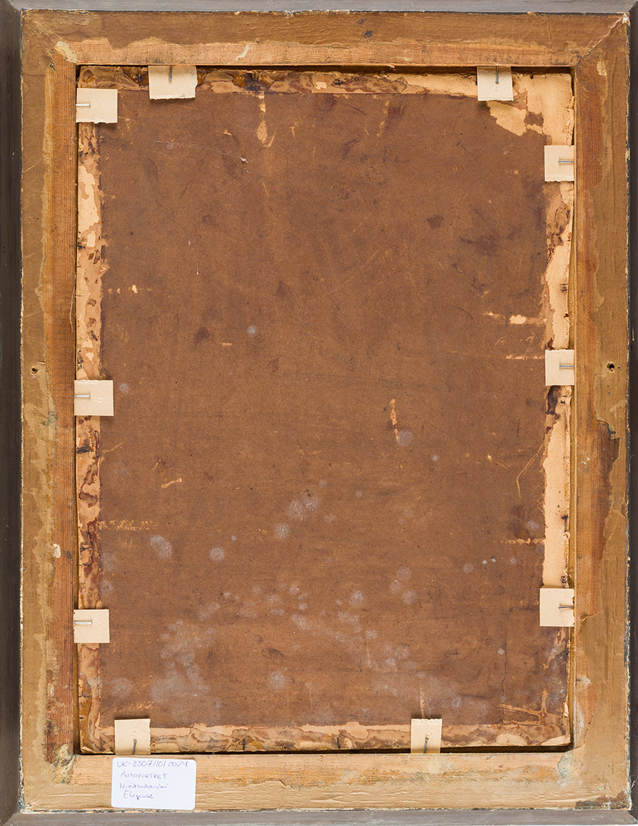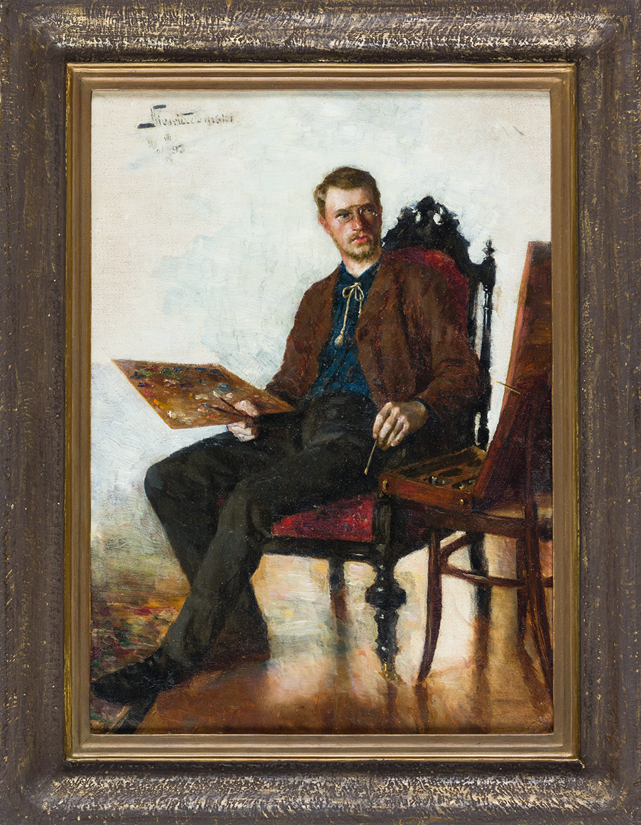 W 1893 roku Eligiusz Niewiadomski namalował swój autoportret. Był wówczas wysoko ocenianym studentem akademii w Petersburgu, laureatem srebrnych medali i stypendystą uczelni. Zainteresowania malarskie Niewiadomskiego skupiały się w okresie petersburskim na aktach, malował tez szkice pejzaży z Finlandii. Dobrze zaznajomiony z historią malarstwa europejskiego jak również z aktualnymi trendami artysta zręcznie wykorzystywał w swoich kompozycjach zaczerpnięte motywy. W nagrodzonej pracy dyplomowej (1894) znać było wpływy Arnolda Böcklina. W oferowanym autoportrecie Niewiadomski przedstawił siebie siedzącego w fotelu w bliżej nieokreślonej przestrzeni. Zwrócony w kierunku malowanego obrazu, z kasetą farb opartą na krześle, artysta trzyma w prawej dłoni paletę, w lewej zaś pędzel. Jego wzrok skierowany jest na płótno. Fotograficzna w swym ujęciu kompozycja zdumiewa równie fotograficznie oddanymi szczegółami, jak binokle na nosie młodego malarza czy rzeźbione nogi i oparcie fotela. Z drugiej strony całość potraktowana jest lekką plamą barwną, ze swobodą artysty pewnego swoich umiejętności. Szczególnie interesujący jest sposób zastosowania światła, które wydobywa portretowanego z nieokreślonej niczym przestrzeni, w której się znajduje. Z przekazów rodzinnych wiadomo, że Niewiadomski namalował przynajmniej jeszcze jeden swój autoportret, na którym jedna z towarzyszących mu nimf ozdabiała skroń artysty wieńcem z wawrzynu. Ślad po nim jednak zaginął. Oferowany autoportret, utrzymany w bardziej realistycznej konwencji, dowodzi istotnego talentu dwudziestoczteroletniego Niewiadomskiego i rzuca zupełnie nowe światło na odkrywaną dziś na nowo spuściznę tego artysty.