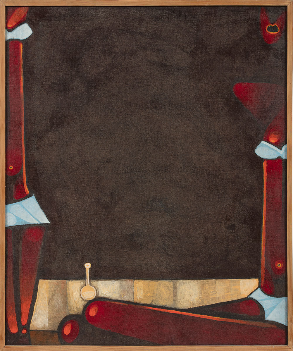 Prezentowane dzieło z 1975 r. należy do wyjątkowego cyklu „czarnych” aktów Nowosielskiego i przedstawia dwie postaci kobiece w błękitnym bikini. Sylwetki zakomponowane wzdłuż krawędzi obrazu, odsłaniają centralną, czarną pustkę. Dominująca pełna napięcia przestrzeń rozciąga się, działa jak siła odśrodkowa, spychając kobiety poza granice płótna. Schowane i anonimowe, pokazują tylko fragmenty swoich smukłych, wydłużonych ciał. Egzystują w uproszczonej, metafizycznej przestrzeni niczym „(…) zjawy z iluministycznych misteriów. Ich geneza sięga 1971 roku, kiedy to artysta opracował scenografię do »Antygony« w reżyserii H. Kajzara. Owe eteryczne akty są próbą przekroczenia własnych kanonów malowanych postaci, a także wysiłkiem budowy ciemnych obrazów, które jeszcze mocniej niż we wcześniejszych dziełach sugerowałyby nieskończoność, czyli unaocznienie duchowości” (Kostołowski A., ze wstępu do przewodnika po wystawie J. Nowosielskiego, Muzeum Narodowe w Poznaniu, 1993).