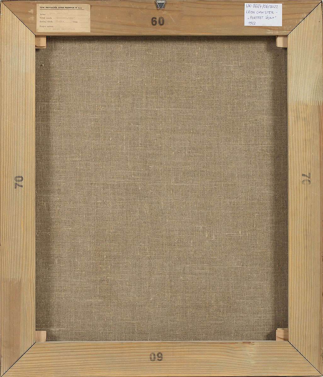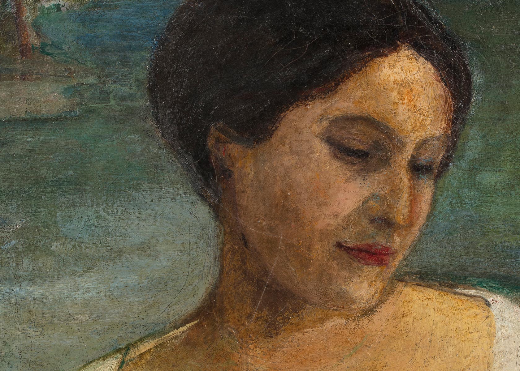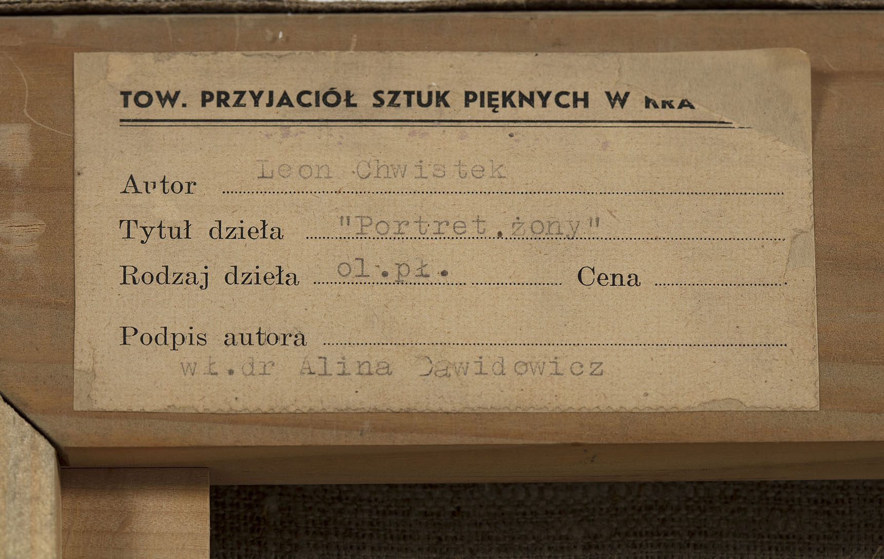 Prezentowane dzieło Leona Chwistka z 1922 roku to portret jego żony Olgi, z domu Steinhaus. Artysta przedstawił ją na swoim płótnie w popiersiu, na tle pejzażu. Spięte do tyłu ciemne włosy kobiety, odsłaniają piękną twarz, ujętą z prawego półprofilu. Jej głowa opada lekko w dół. Oczy ma przymknięte, a kąciki ust delikatnie uniesione w bardzo subtelnym uśmiechu. Ponętną szyję i szlachetny owal twarzy podkreśla wycięcie dekoltu jasnej bluzki, kierując spojrzenie widza do centrum.