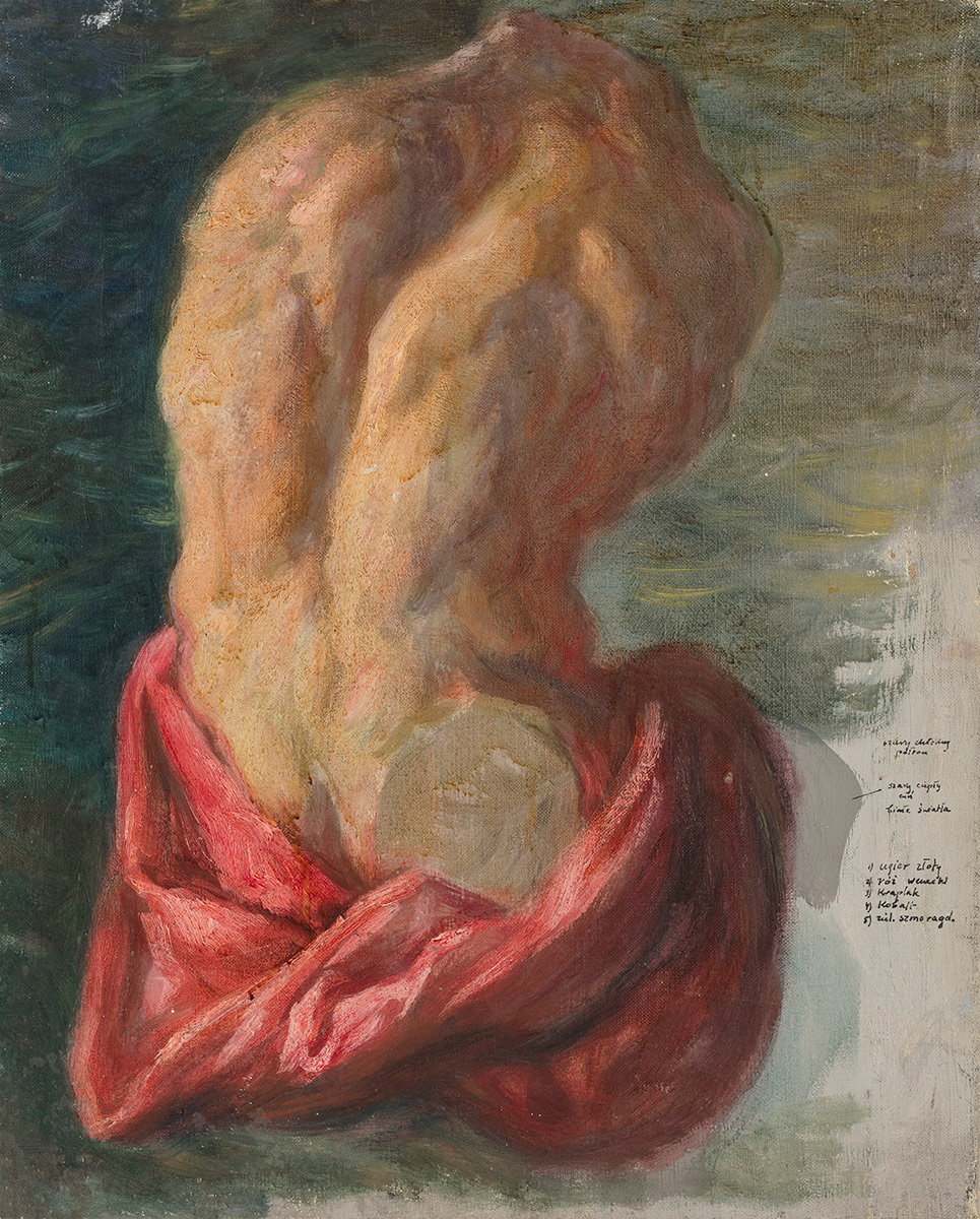 Oferowana para męskich aktów wydaje się pochodzić właśnie z tamtego okresu, kiedy to dwudziestokilkuletni artysta ćwiczył swoje techniczne umiejętności pod kierunkiem profesora Kowarskiego. Jak wiadomo studium z żywego modela czy odlewu antycznego posągu stanowi jeden z podstawowych etapów akademickiego wykształcenia. Szerokie, zdecydowane pociągnięcia pędzla i śmiałe kontrasty kolorystyczne zdradzają niewątpliwy talent Fangora i jego późniejsze zainteresowania twórcze. Odmalowane akty posiadają analogię w studium rzeźby antycznej prezentowanym w „Catalogue Raisonné”, udostępnionym przez Fangor Foundation. Praca ta wykonana techniką en grisaille wskazuje na jedno i to samo źródło, z jakiego powstały wszystkie trzy malarskie wprawki.